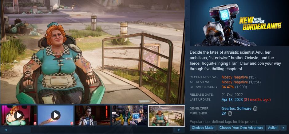 >>724325120Well, probably because 2k/Gearbox didn't make Tales from the Borderlands and they didn't actually want to do anything with it but because it became a well-received little game in the "Borderlands universe" they felt obligated to "be nice" and throw it a small bone.They also paid some random Chinese(?) studio to basically re-release it on Steam with almost no sign of Telltale left on it. The Steam page still says Telltale made it, but the credits in-game is different and the Telltale staff are bumped to last.Later Gearbox tried to make their own Tales from the Borderlands game, but we all know how that went.