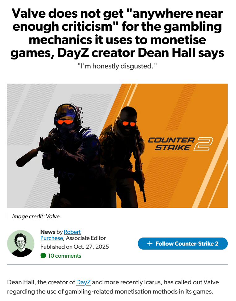 >>724336092>"anywhere near enough criticism"I've been hearing about the "CS gambling problem" and seeing videos pop up about it in my feed for years. All the gambling and trading is being done on thrid party platforms, what do they wany Gaben to do? Compared to the rest of the industry Valve's games are pretty tame when it comes to predatory monetization, their only crime is being so successful and having such large playerbase that it defacto attracts scammers and degenerates.