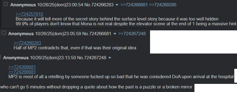 >>724341471Funny tripfag that thinks all games have a second hidden half that only japanese people can access because of their shintoism and divine nature. Anything unknown about in a given game can be solved by going into the second half and learning what it is about from the dev gestalts stuck in the hidden realm. He thinks Japanese people all know about this as common knowledge and don't tell outsiders.He's like 98% right but where he's wrong is crucial.