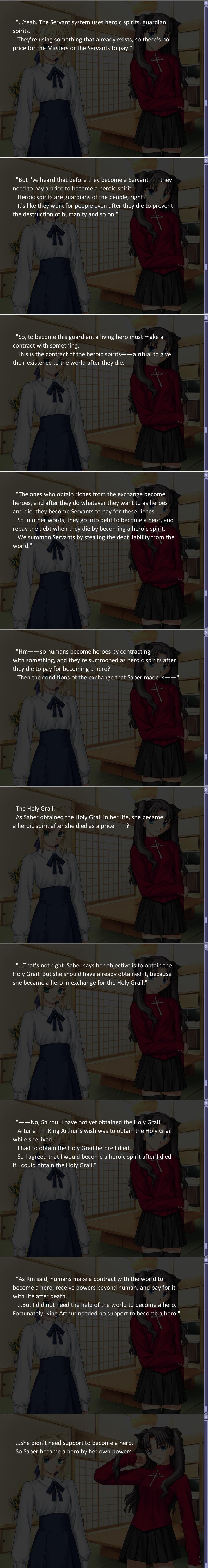 >>724366742Did you read the image?>... Yeah. The Servant system uses heroic spirits, guardian spirits.This clearly states that guardians (occasionally called counter-guardians) are heroic spirits.What the image is pointing out is that according to the original F/SN, most heroic spirits either gained the power to become a hero or something else in exchange for becoming a heroic spirit/guardian after they die. The scene in the image is part of the revelation that Saber is actually still alive and not yet a heroic spirit. This is the real reason she cannot dematerialize into spirit form like other servants (she lied about Shirou not having enough mana to allow her to do this) and this is also why Archer says in the HF route that she is not a guardian. The only other example of a servant that was not a heroic spirit/guardian is Assassin and that is because he was a familiar based on a myth that was summoned using the servant system (an advanced familiar system designed by the Makiri clan).