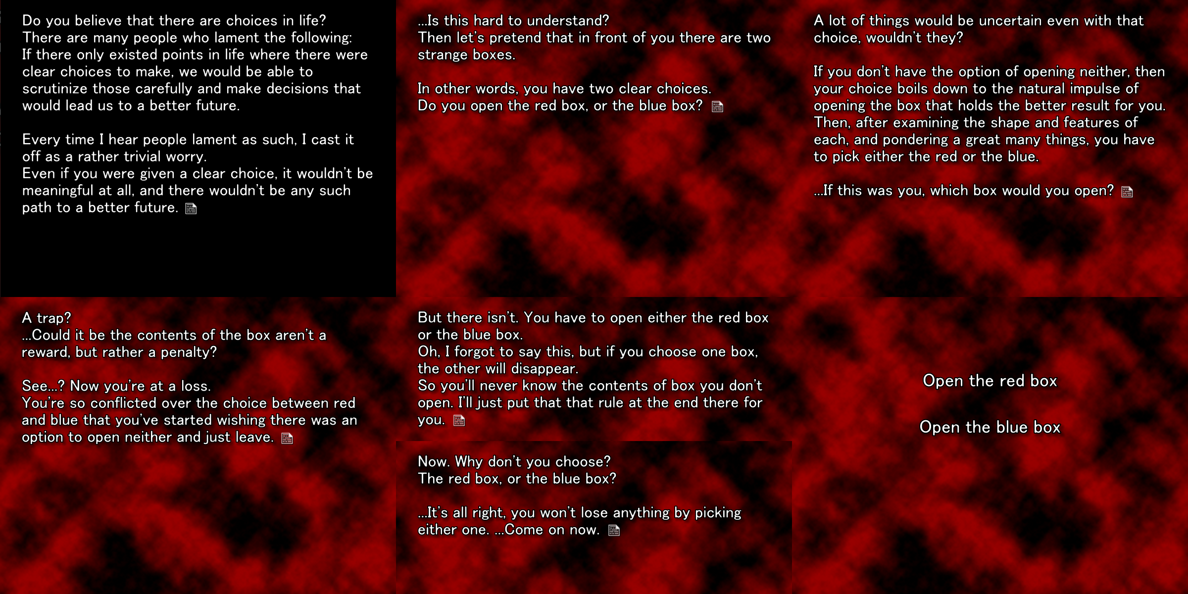 >>724376479When you play a very limited PnP without dice, pen and paper you still play a game.This entire taxonomic idiocy is inadequate. A computer game is a process. An computer driven interactive book is exactly that, a book, but it is an interactive process, however limited it is.You should consider that even without eventual evolution of any genre, computer gaming always was an extremely broad category, and that novels and games like Phantasmagoria fit in their own subset within it very well.The delivery method is very specific, the approach is specific, and so is the way of immersing in them.