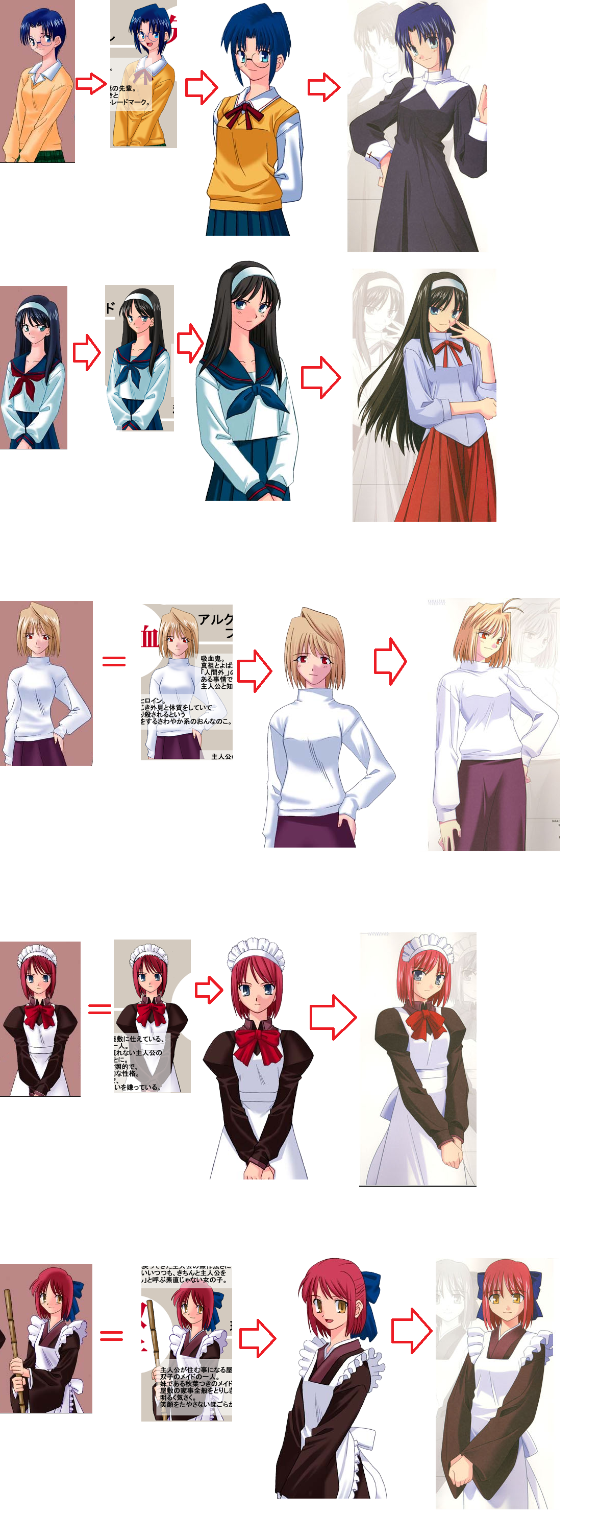 I was reading up on how Takeuchi's art improved from Tsukihime to Fate, and it kind of makes sense except for the part where they say the sprites in Kagetsu Tohya and Plus-Disc have improved shading. The story goes that Takeuchi did the more detailed promotional art sprites first so he had more time to work on the shading which is why they look that way, but he had to rush the sprites for Tsukihime in 4 months while working multiple jobs to fund the project since Nasu was bumming off of him at the time. This is why the final version of Tsukihime's sprites have less shading and some of the CGs can look pretty rough and have garish coloring. Then after they released Tsukihime, they had enough money to hire more employees which led to Takeuchi having 2 new assistants who did the coloring and shading for him. This makes sense for why Melty Blood's and Fate/Stay Night's art looks so much better. But the sprites in Kagetsu Tohya and Plus-Disc have the same level of shading and the same style of coloring as the OG Tsukihime despite these art assistants helping with those too. So I was wondering if there was an earlier version of Tsukihime with worse looking sprites and if that is why they claim the KT+D sprites are such a big difference. Does anyone know? I know that there was an earlier demo version of Tsukihime that they sold to raise money during the development, but I don't think that is what is being referenced