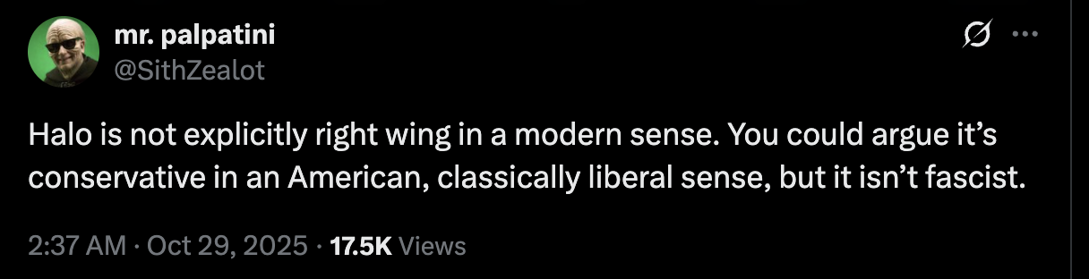 >>724451684>this screencap triggered the shitlibs so muchAnyways Halo is not a woke game, it's an explicitly American game of Christian space marines killing jihadist Islamic aliens that threaten the existence of humanity