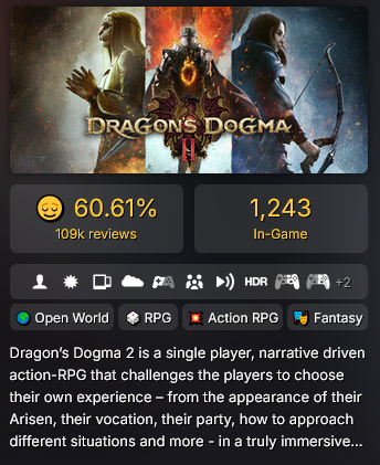 The movement in this game is utter garbage, the momentum they added completely kills the snappy and responsive movement the original had. Then there's all the bullshit staggers, enemies bumping into you and you go into a long stumble animation and then there are all the dumb shockwaves locking you into perma stagger. The world feels empty and pointless, the best equipment can be bought from shops, none of the side quests are even remotely interesting, all npcs are either completely forgettable or downright annoying. Goblins and saurians spam everywhere, less monster variety than vanilla DD despite a ton of monsters being added in the failed MMO. Story is absolute ass, the whole throne subplot gets completely thrown out of the window, probably because the game got rushed again, and now you have to fight not-Grigori but this time instead of an epic chase through the mountain ruins it's just a shit cutscene with an absolute dogshit monologue compared to the first. The list goes on and on, this game convinced me to not buy anything from Crapcom ever again, nothing they do will change my mind, fuck this dogshit company and boy oh boy did I dodge a bullet with MH Wilds.tldr, fuck Itsuno and fuck Crapcom.