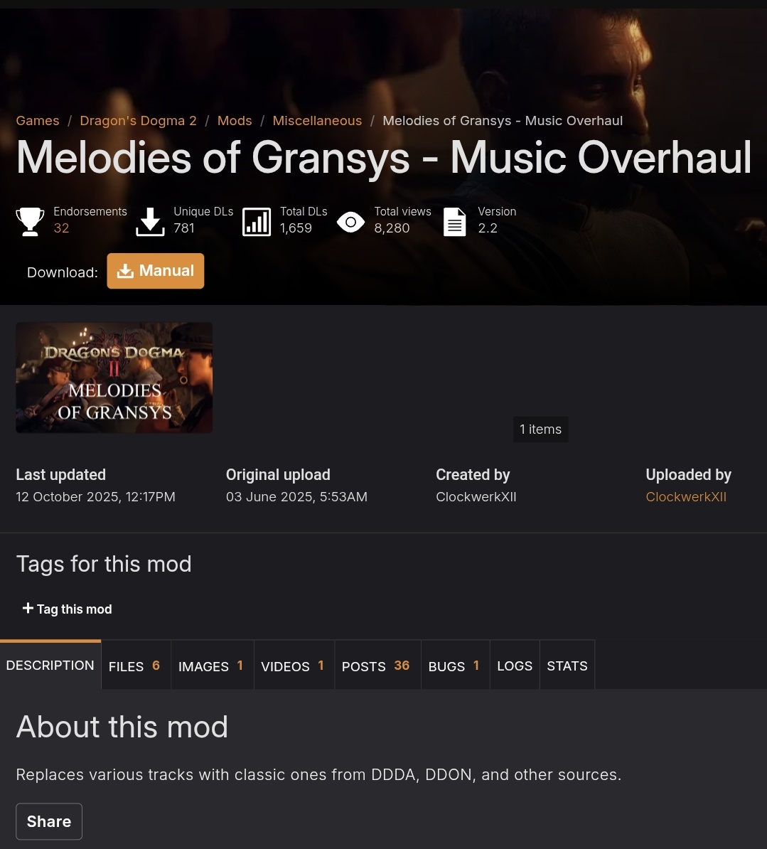 >>724513440If you're like me, you can use this mod to overhaul the entirety of dd2's music with a much better selection. https://www.nexusmods.com/dragonsdogma2/mods/1169