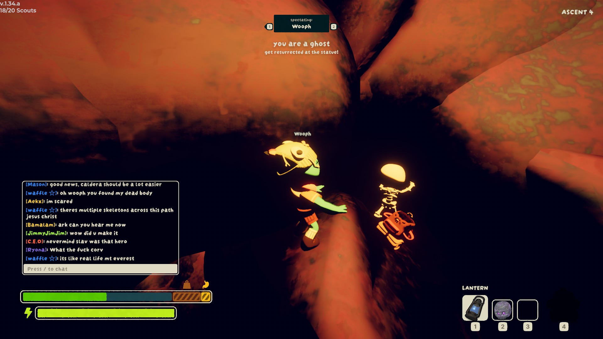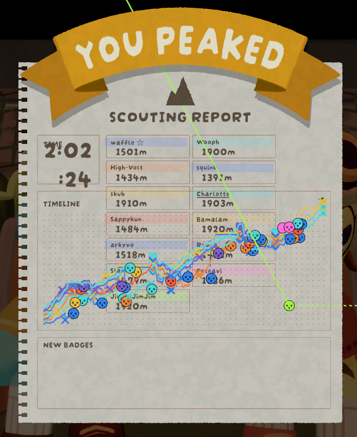 >end up at the very literal bottom of Mesa>waffle ends up there too but he's dying>grab him and climb up>keep climbing up>climb even higher>I feed him a banana to see if that wakes him up>he's holding it now but still dead>grab him again>he's somehow turned into a bull and I'm the rider>As I'm climbing up he's somehow dragging me all around>I need to dodge cacti, pitfalls, and try not to lose energy as I'm carrying him and he's yanking me every which way even if I'm not moving>I'm 5-10% distance away from the peak>try to side climb>he yanks me back enough that I lose stamina and can't lunge>we both fall to our deathsThat was the most exhausting experience I've had in peak so far but it was fun