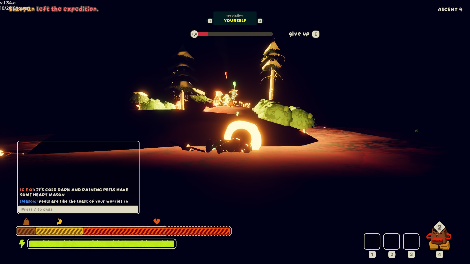 >>724617501I find the freezing just slows the game down too much. It promotes sticking together which is good, but I think it should be swapped for something else that also actually does something in Caldera/Kiln. Maybe some kind of "loneliness" bar that fills unless you're near other scouts or have Bingbong?