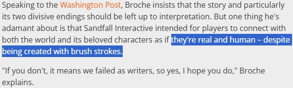 >One of the best storylines in gaming >Discussion always dominated by the last-minute shoehorned in 'moral dilemma' ending that made no sense because its presented as a hard choice when one of the two options is a mass-genocide and all the characters we like die.I'm mad about it. Up until the very end I honestly didn't think we were ever meant to think Renoir had a point because it never indicates that the painted characters are anything less than real, sentient beings. It's not a proper moral question because all the debate just ends up being over whether or not the people are real, because no-one could seriously support Verso's ending if it means an actual genocide.