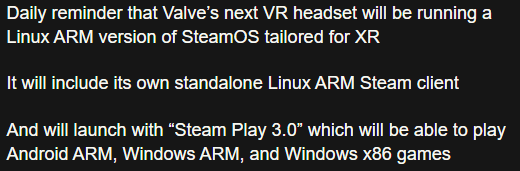 Daily reminder that Valve’s next VR headset will be running a Linux ARM version of SteamOS tailored for XRIt will include its own standalone Linux ARM Steam clientAnd will launch with “Steam Play 3.0” which will be able to play Android ARM, Windows ARM, and Windows x86 games