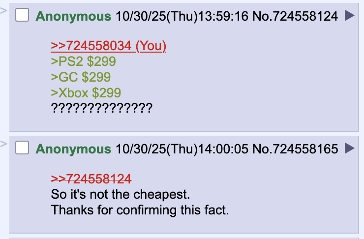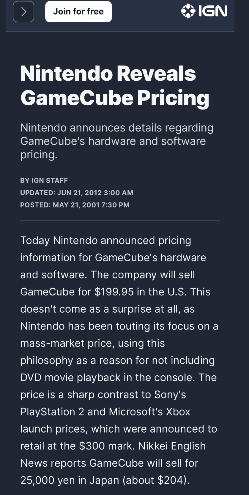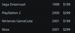 >>724563103https://www.ign.com/articles/2001/08/14/xbox-game-prices-revealed>With the system launching at $300.00https://www.ign.com/articles/2000/05/12/e3-2000-ps2-us-launch-details-revealed>Price: As speculated, the US launch price for PlayStation 2 is $299 - just like the original PlayStation. https://www.ign.com/articles/1999/04/20/dreamcast-launch-plans-unveiled>Dreamcast will launch in the US on Sept. 9, 1999 at a manufacturer's suggested retail price of $199https://www.ign.com/articles/2001/05/21/nintendo-reveals-gamecube-pricing>Today Nintendo announced pricing information for GameCube's hardware and software. The company will sell GameCube for $199.95 in the U.S.