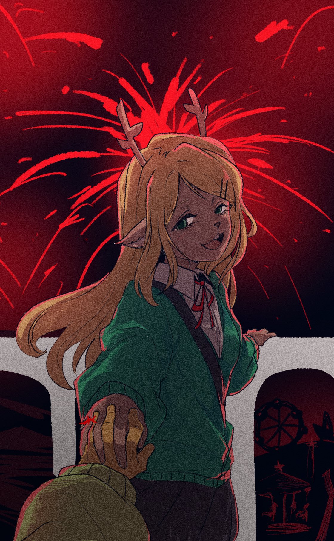>>724588453What if the ferris wheel romantically stops with Susie and Kris at the height and they don't know why so it turns into an awkward teen romance scene meanwhile on the outside Noelle is climbing up to them with a knife clenched in her buckteeth