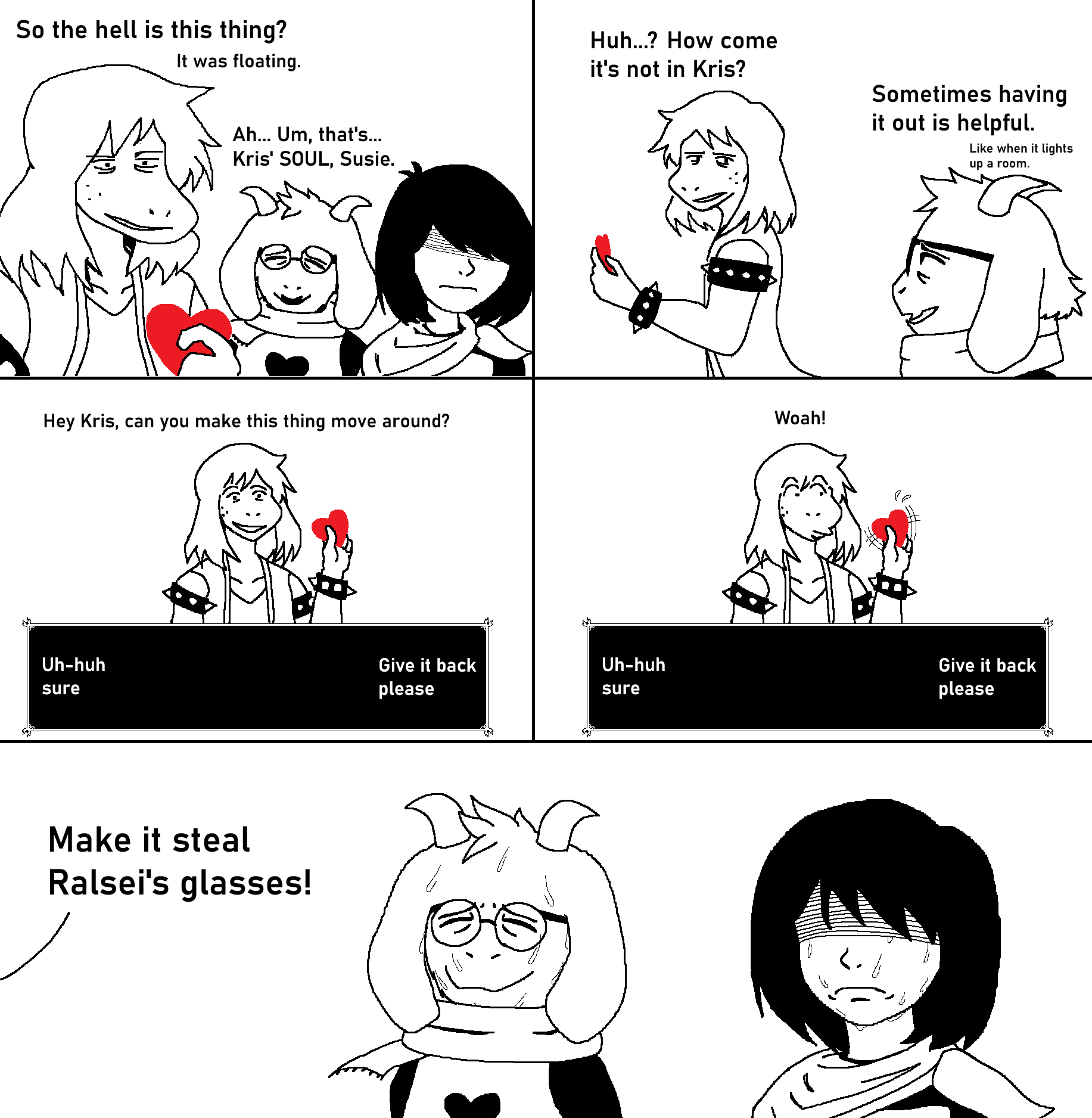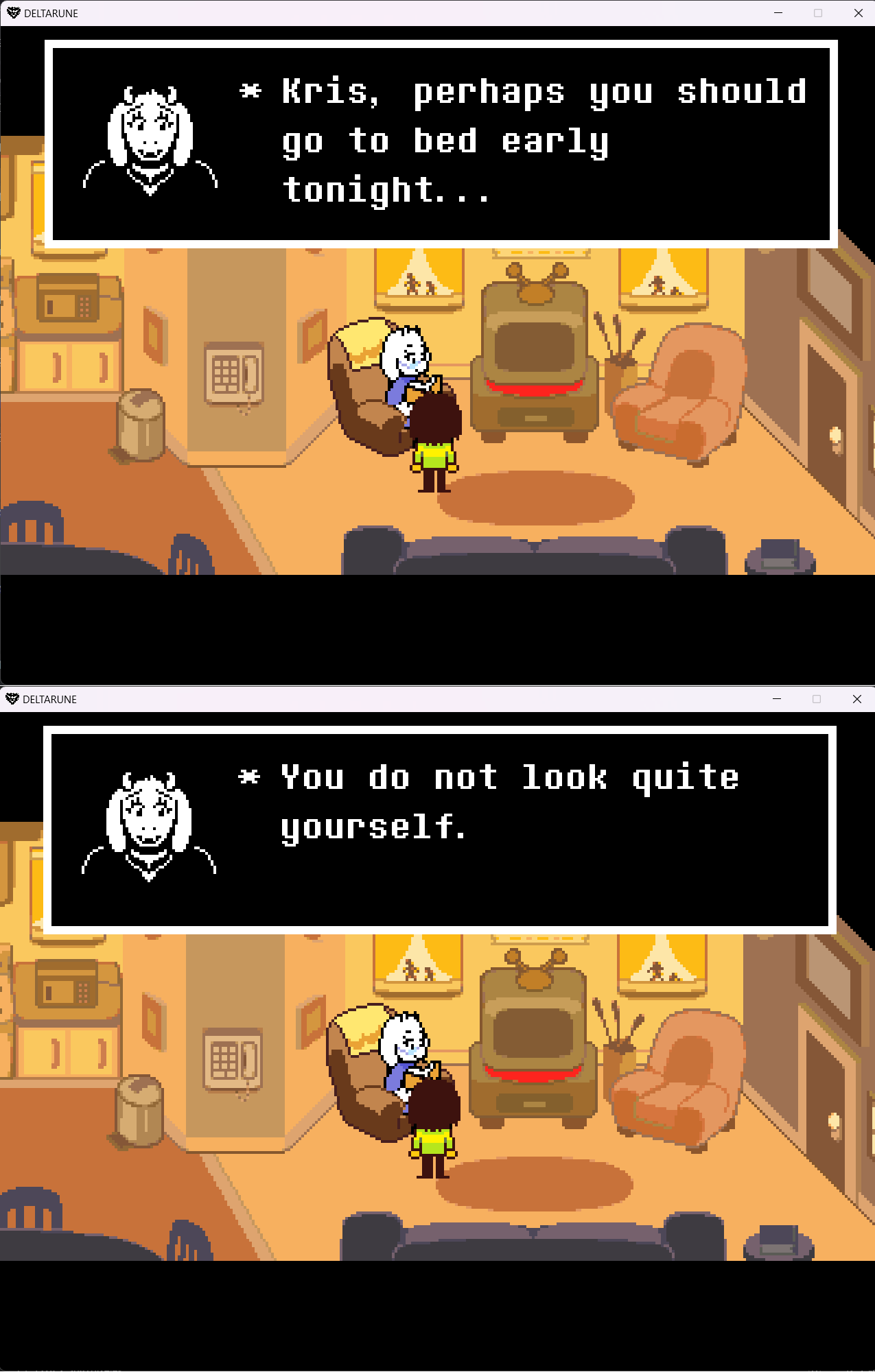 Hey, got a little theory autism, but it's really been on my mind.Do you think Kris has a different dark world appearance without the soul?>every time we leave, Ralsei tells us to close our eyes first>Kris doesn't open them again until after we're back>the only other time we're apart is in the complete darkness of the Sound of Justice fightIt makes sense that a Kris without our influence would look different, and the game seems to be going out of its' way to make sure we don't see it.