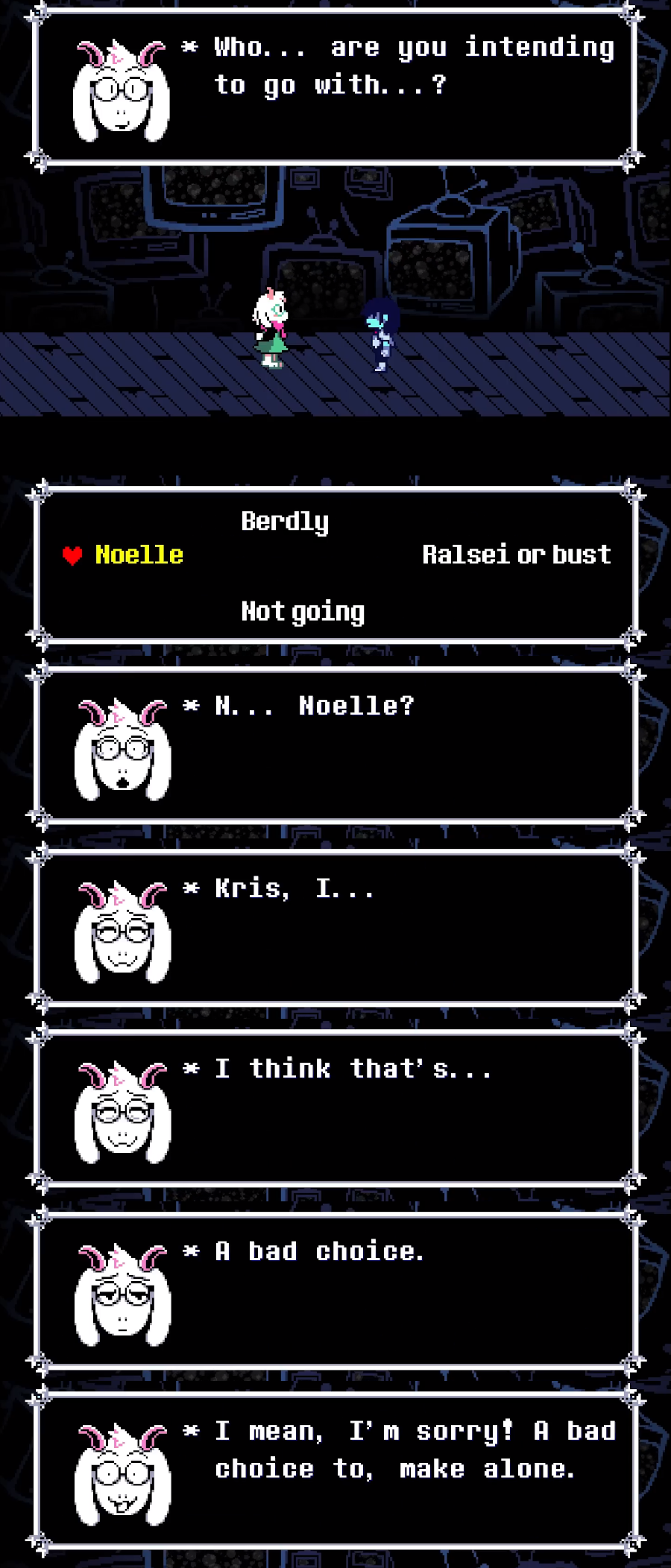 Snowgrave route is setting up Noelle to be our vessel, which means we're ditching Kris. No whiny emo kid to get in the way of my doe love