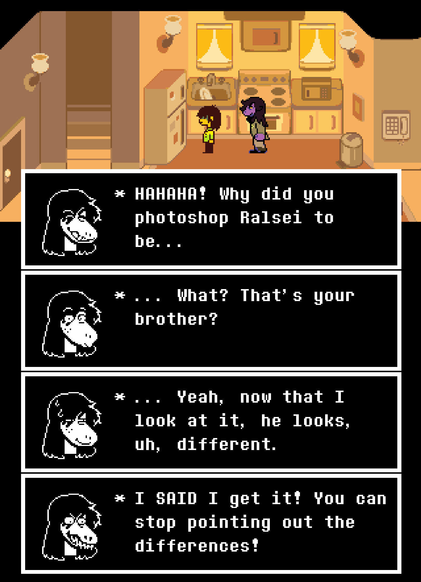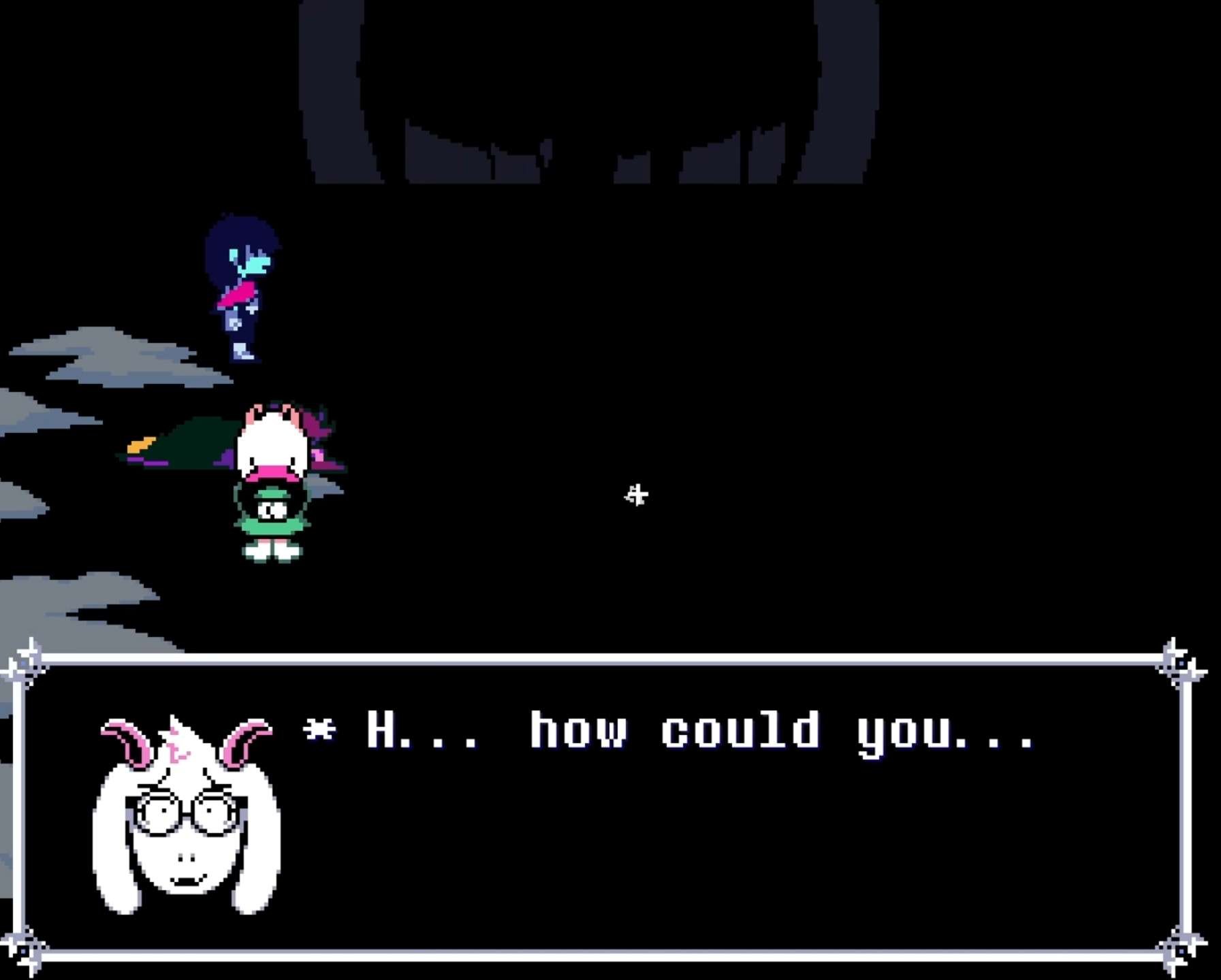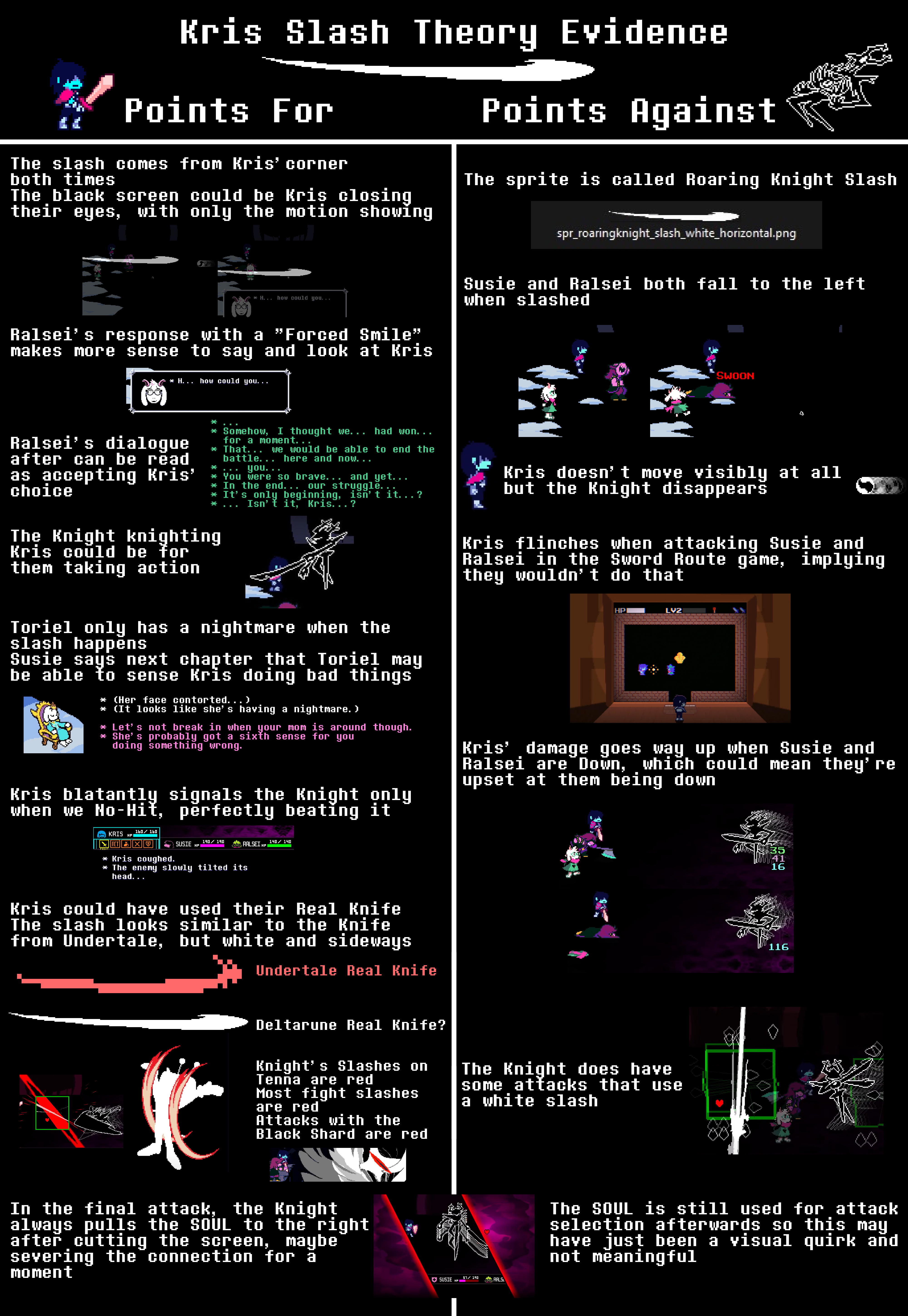 >>724611238I agree, and I think Kris and Ralsei are cooperating as well.From the start, Kris and Ralsei agree to deal with Susie as she’s a “problem”. Kris also performs actions they don’t have to with Ralsei, like hugging Ralsei, or the “Ralsei or bust” option when asked who they’ll go to the festival with; Kris only embellishes choices they like, see “Banging sermon my man”.Moreover, Ralsei knows every dark world, and probably even its origins and who made the fountains for each, as Ralsei can detect fountains opening (see the prophecy cutscene) and “go” to the dark world. This means Ralsei knew Kris opened the ch3 dark world. When Susie does the same in ch4 she gets scolded by him for trying to bring Gerson back, but Ralsei does nothing of the sort with Kris.It’s probable Ralsei, with his knowledge of the prophecy, knows what Kris has to do (whatever they’re doing), and allows it and even cooperates. This would only make the eventual Susie crashout worse, Vs. Susie Reprise is gonna be a banger.