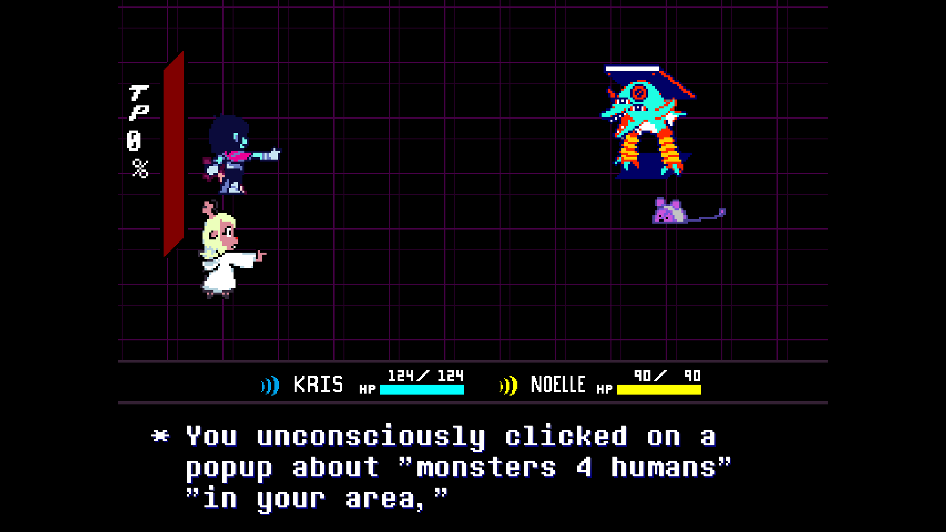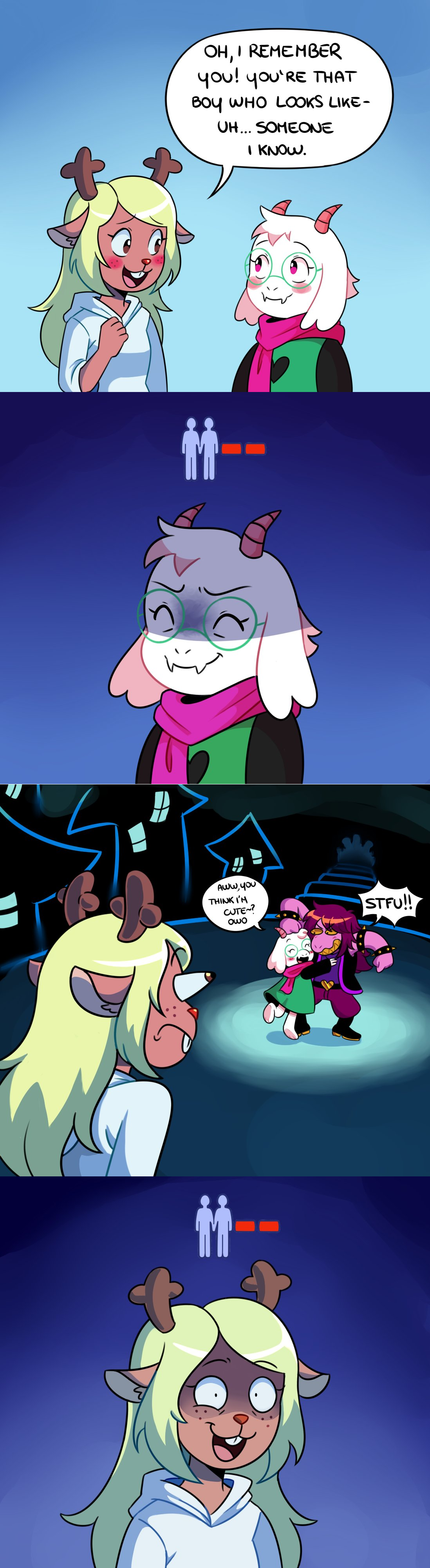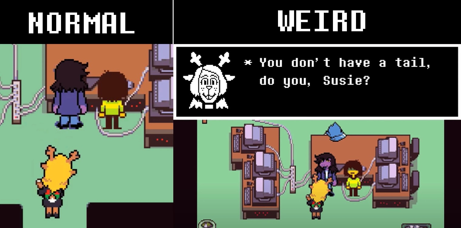 >>724588165susie already can openly tell kris that the two of them being together is a given in ch2 when you pick her when she asks if he wants to go with either noelle or ralseiif anyone is going to be the third wheel it's noelle, who will misinterpret susie asking her to go as a romantic thing instead of susie wanting to hang out with all her friends at the festival