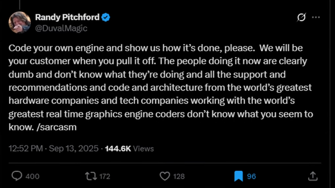 >>724632572Or they could simply choose to not use UE5. It's not like it's the only engine on the planet.Ironic, Randy telling people to code their own engine when he couldn't even do it himself.