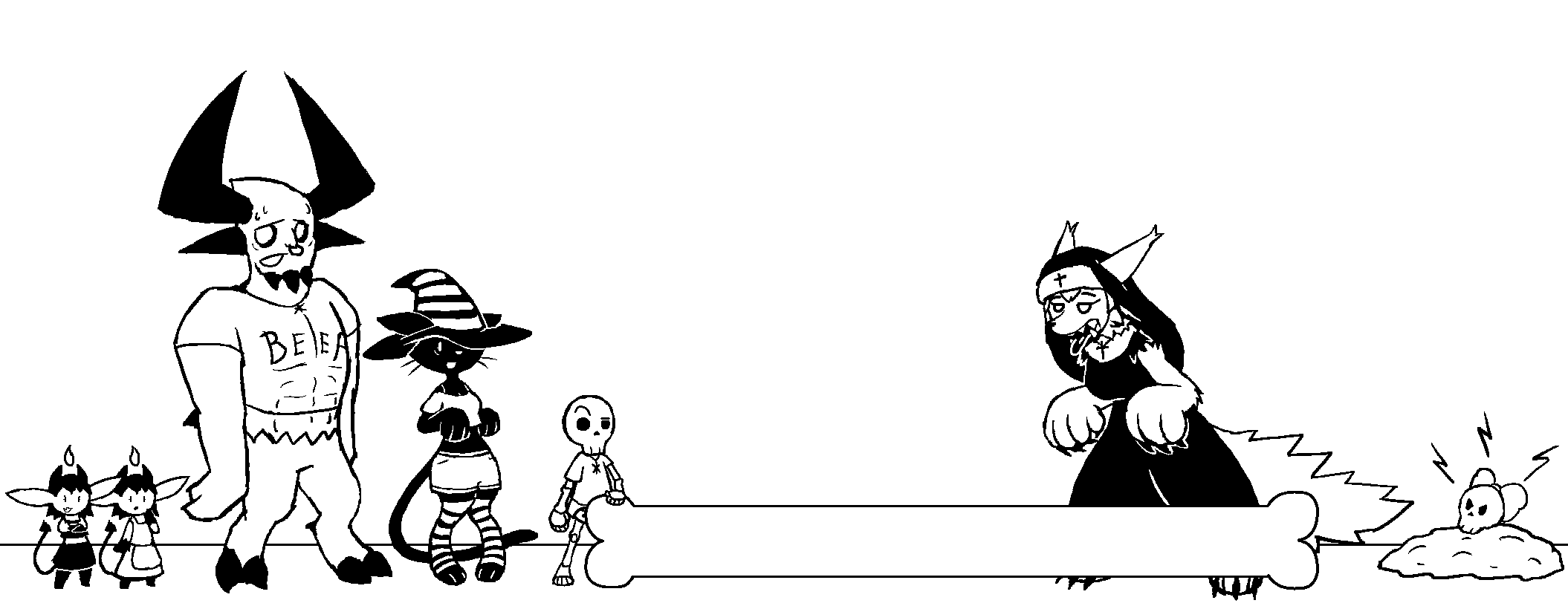 Skelebro needs your help! He went to visit his pals for another spooky gaming night, but his Skele GF hadn't shown up. When they went looking for her they discovered she had been buried by Werewolf Nun who wanted her Bones. Demon Bro and his Imps can't get near cause of her Holy Aura and Cat Witch can't get near cause her Cat side wants nothing to do with Dogs. Use your gaming knowledge to help Skelebro save his Skele GF.