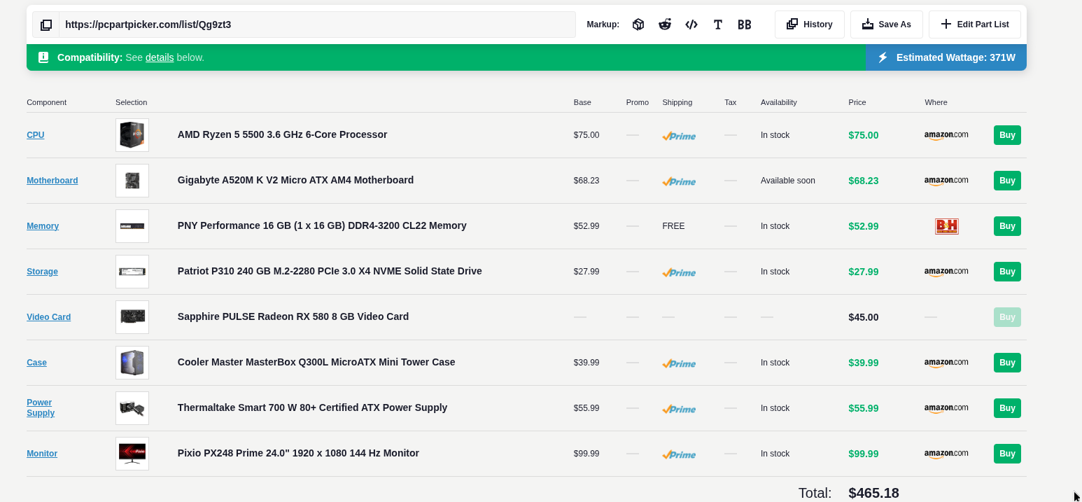 >>724677579I edited this build to be cheaper you can buy a chink $26 case off aliexpress they charge free shipping.I also changed the PSU to a 600Whttps://pcpartpicker.com/list/yL3Dt3