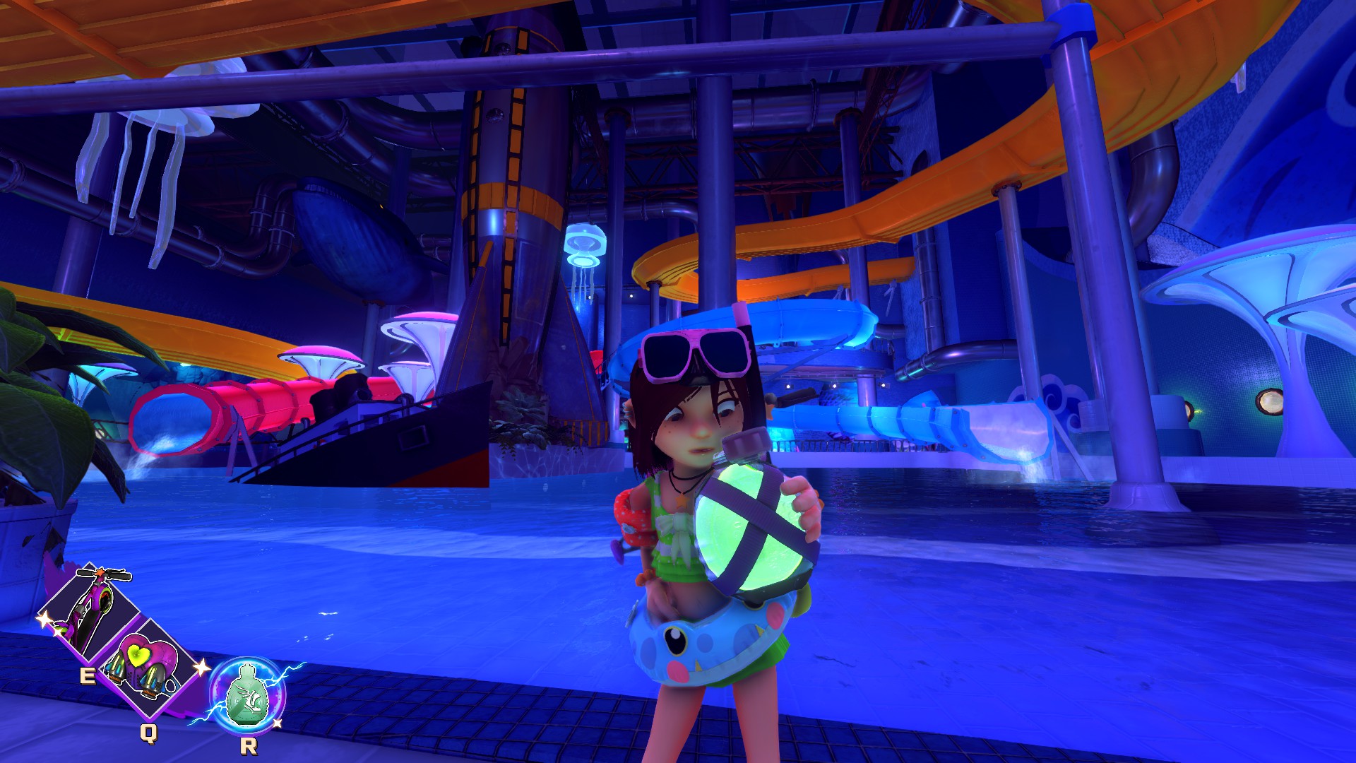 >Giant water park level in Corpopolis with working slides>completely optional, barely any enemies and barely lit?????