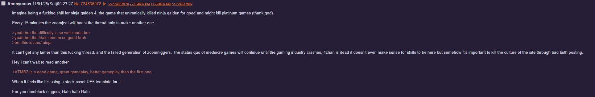Why does this game make NG2 fags seethe so much? Even my DMC fag and NG1 autist friends love NG4, I see Bayo fags praising the game too. The only hate I see is from Hardcore Itagaki NG2 purists which makes me even mire curious what that shilled youtuber electric underground guy will say about the game.