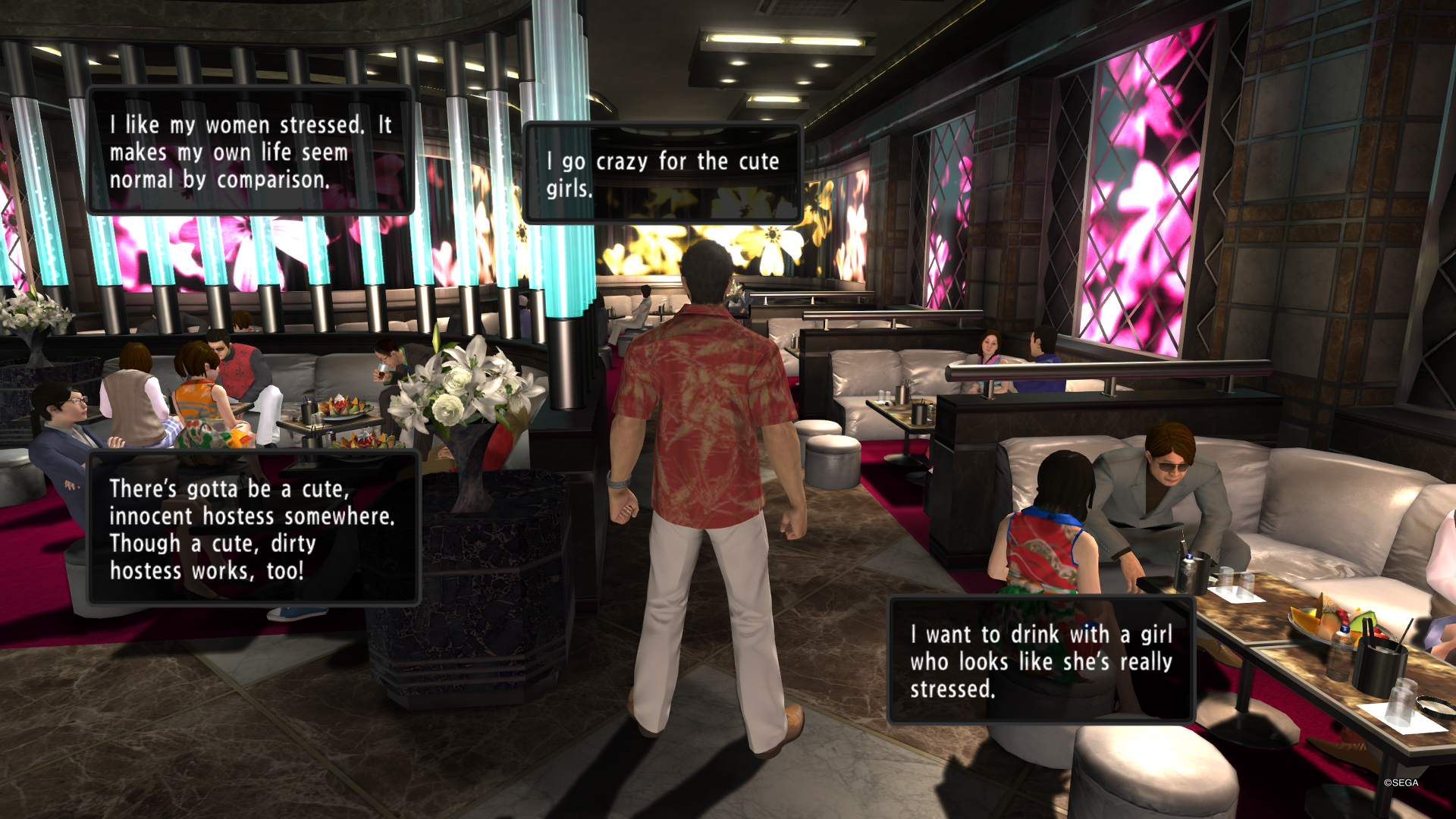 >>724695713>The cabaret club is a full on main minigame (which usually don't tend to return at all), the hostess dates are basically substory tierThing is in 3 and 4, you run a cabaret club, and go to a different hostess bar to date the girls there. In 0 and K2, it was merged to both.