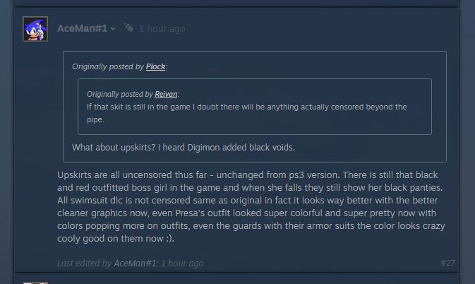 >Pantyshots still in >Preza still feels up Milla in the first meeting >Teepo still talks about Bazongas >Jude and Teepo (Elize) both just blatantly mention that Milla is hot af Literally the only confirmed change is removal of the pipe accessory. Which is a ratings board thingI assume the middle finger being changed to pointing is also still in but thats all the way near the end of the game so I can't confirm it for a while
