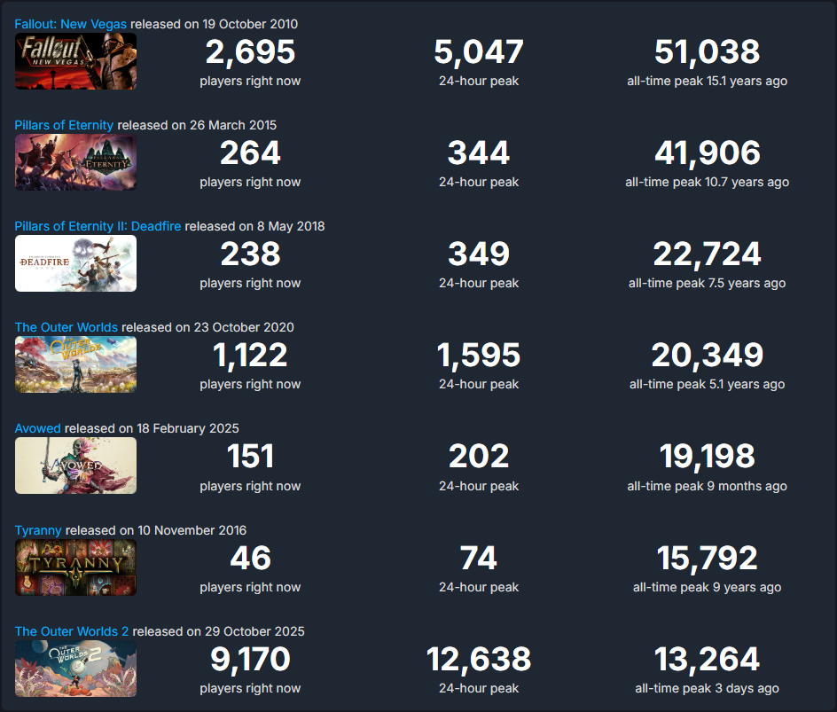 Well, New Vegas is a masterpiece, Outer Worlds is better than Starfield, Avowed was actually fun if you're not a little bitch whining about clutter not having physics - they're good enough as a whole.