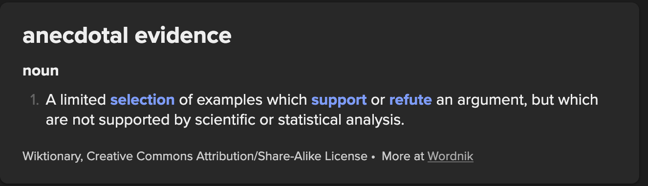 >>724704039Your use of stories are Anecdotal Evidence, according to your own cited dictionary. They fit the definition to a T, again.Why are you getting so upset over this fact?