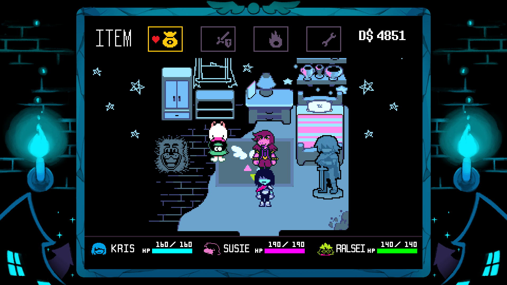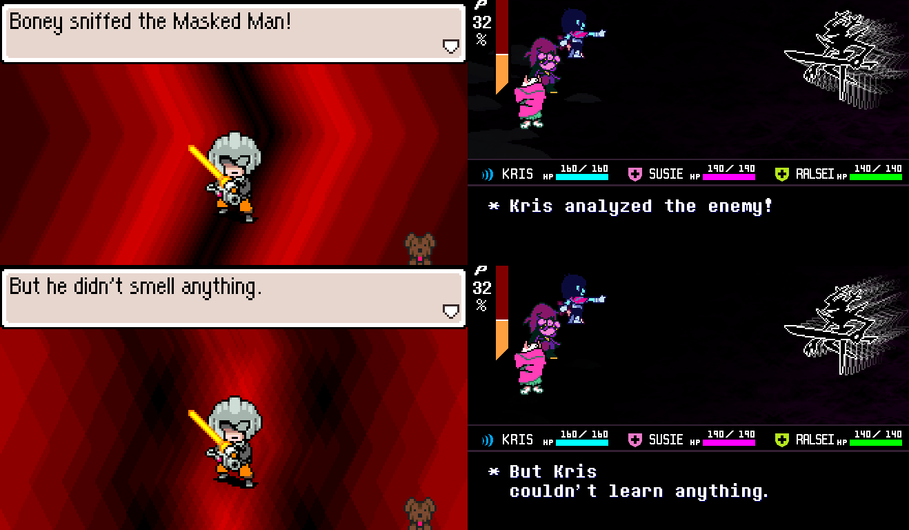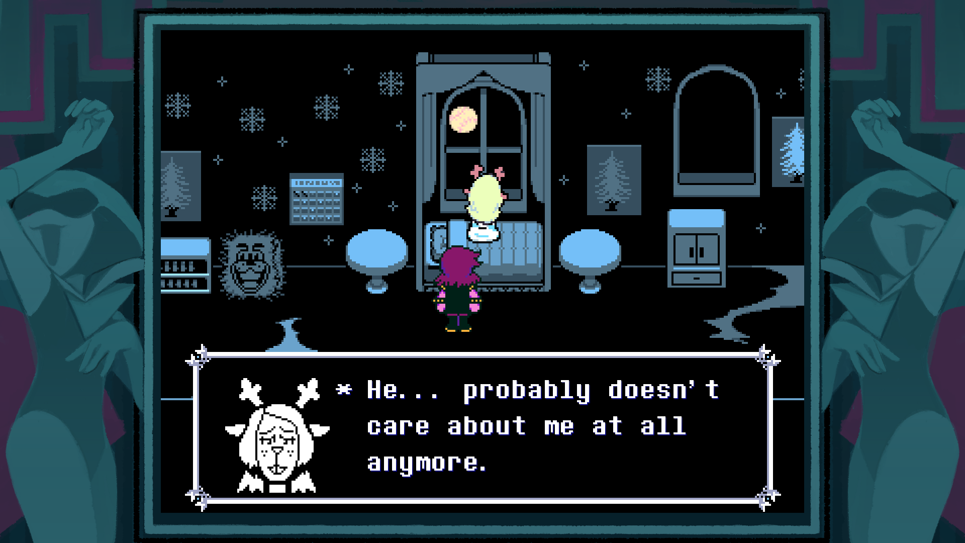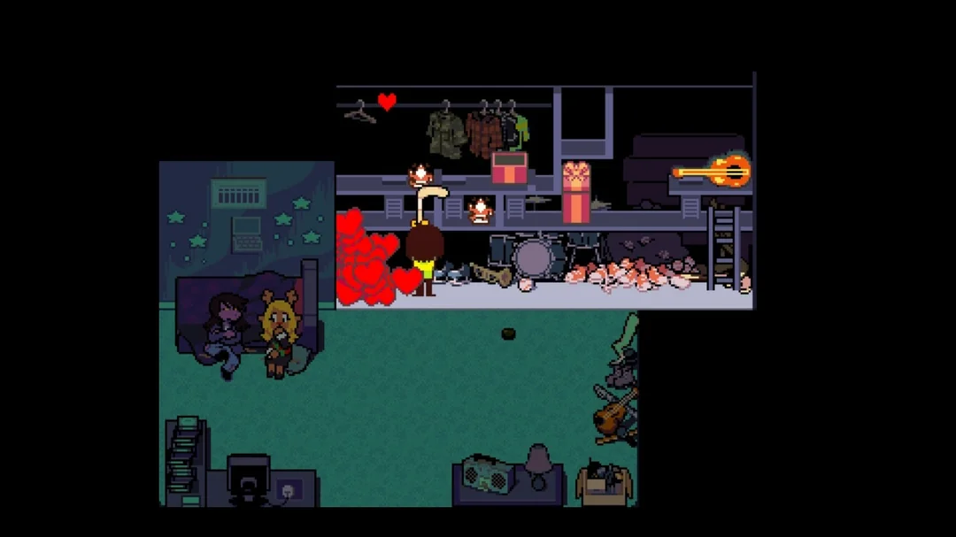 >>724716290Everybody can hear the game music. Pretty sure Susie and Ralsei mention it at some point. The second is very significant though.