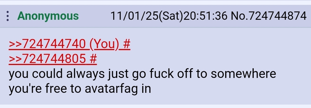 >>724749441Do you really not see the flaw on your logic?By announcing your reports that openly, you have given the jannies a valid reason to hit you with a ban. And thus you have no way to prove you got banned just because you called out an avatarfag (or several).