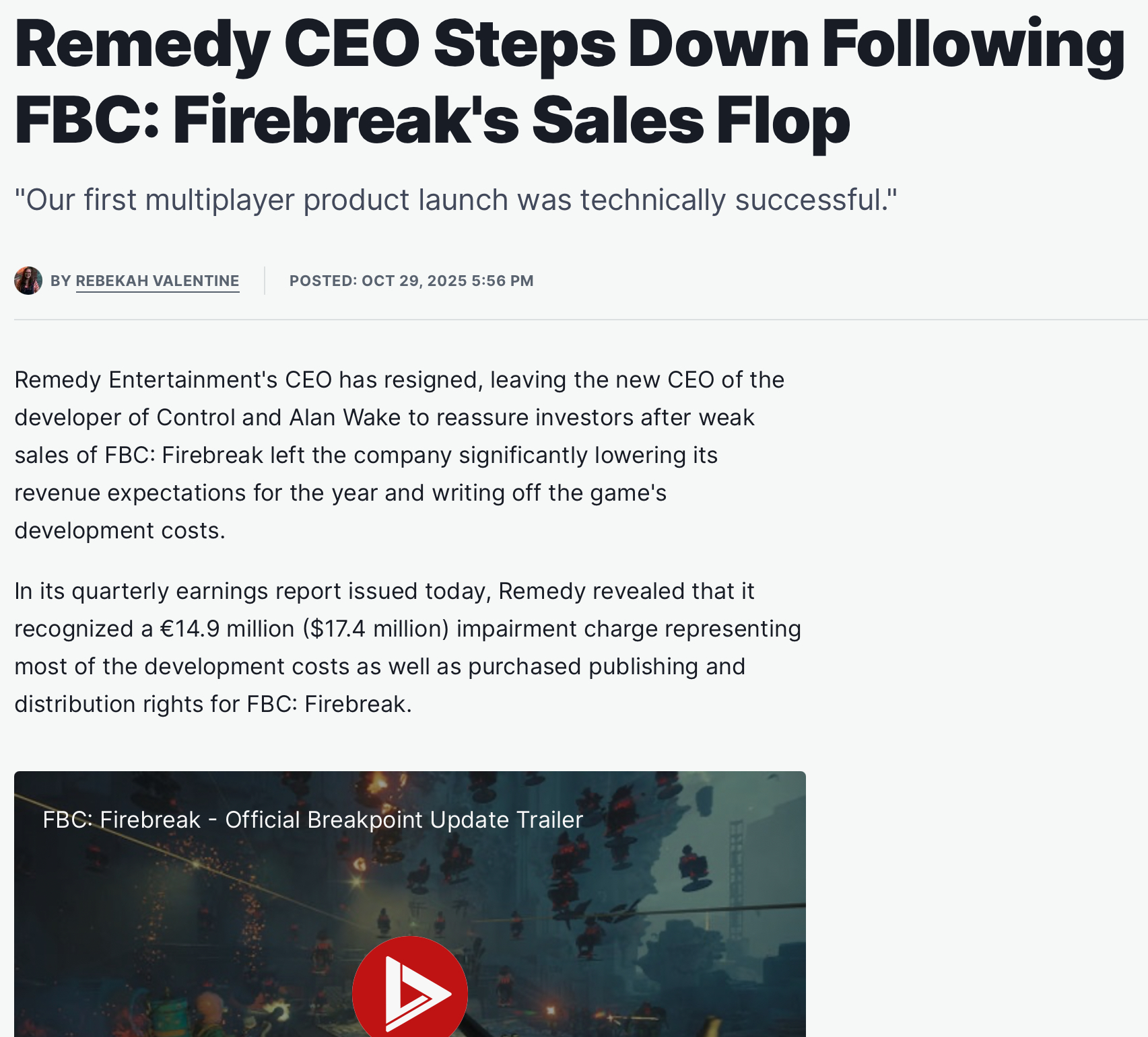 >>724713848FBC: Firebreak is something that sounds incredible on paper and was excited until I saw the reviews and gameplay. It truly takes incredible lack of talent to produce something this sub par out of a great concept.