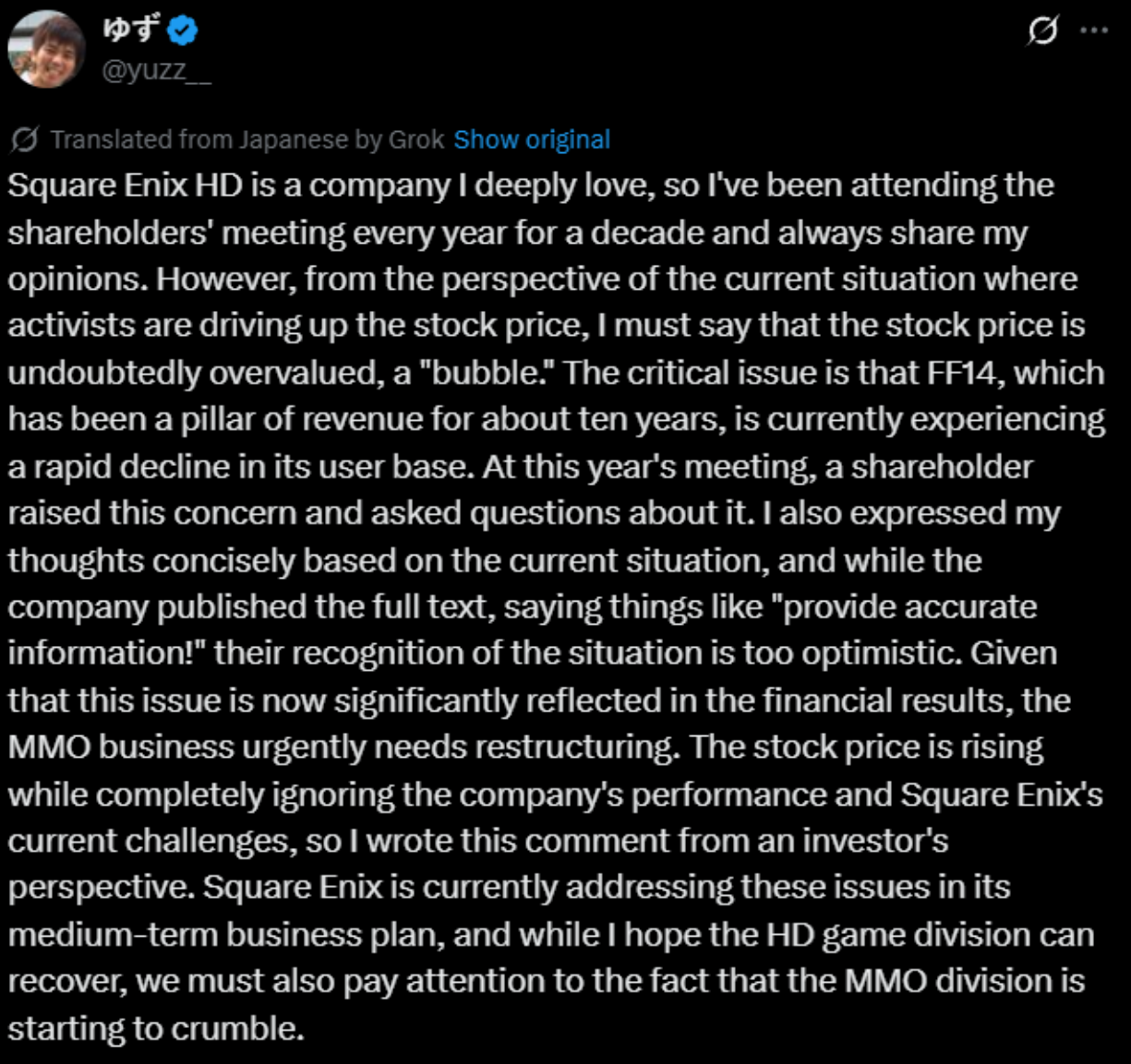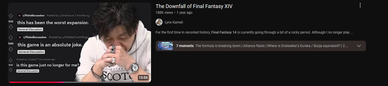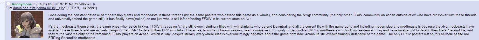 >>724718737>Just feels like this comes from a place of pure desperation or that they've already written the game off as a failure with no future so it doesn't matter to them.The next expansion will be the actual deciding factor for this.What feedback they were listening to will be obvious in the first few hours. Where it could be a failure is that they already had the content loaded up since before the beginning of dawntrail and they didn't really change anything in reaction to Dawntrail's failures.