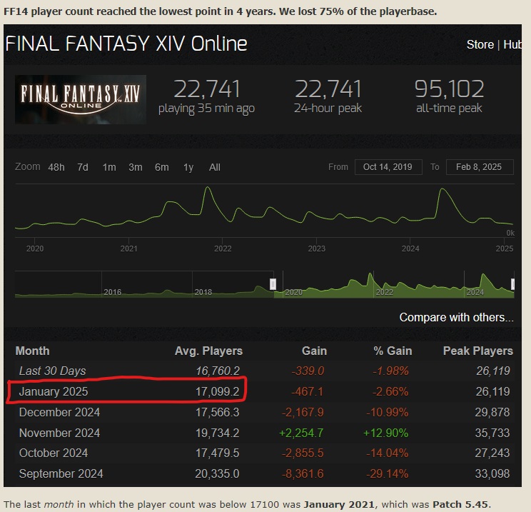 >>724738595Playerscope said 300k (and that was months ago), bancho has 800k. I dislike DT immensely but I think 300k is a lot more calamitious than it actually is, the 800k feels more plausible, or something in between.>>724737425The big night-a-mare is the infinitesimall blue. Look at how you have to go back to 1.0 to reach that level of no new players. It's a reason I wouldn't be shocked if 8.0 has some major change to the earlier content - be it a level squish and difficulty adjustment in old content to be more difficult or something more substantive. That said, this doesn't capture the Chinese market I think, or the mobiles and shit, so they are clearly trying to get more revenue sources.