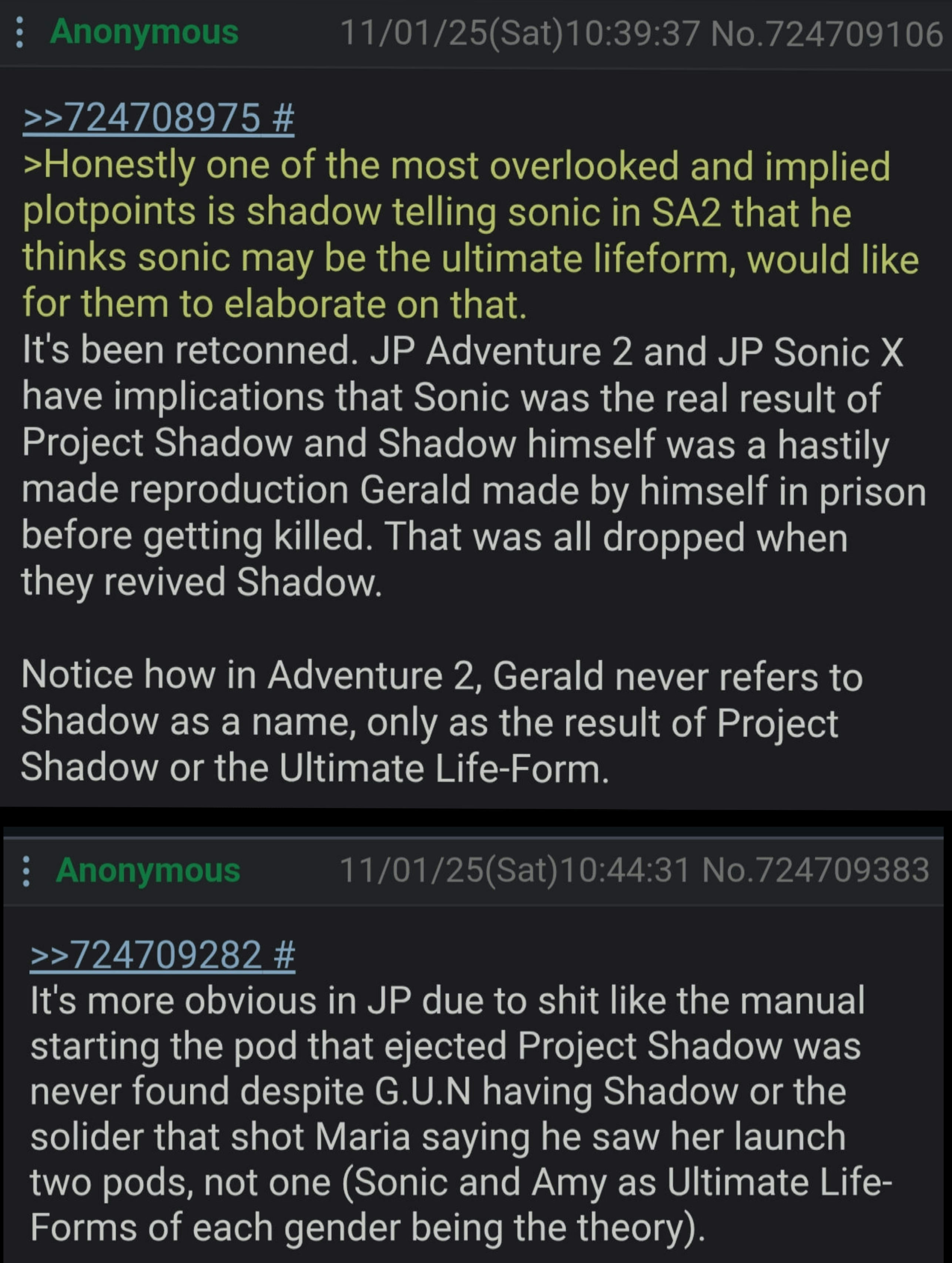 >>724725689>Shadow is an attempt at creating the Ultimate Life Form which accidentally created Sonic???