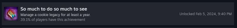 >>724731845Each of those 20 blue icons is equivalent to ~55 real life days of time spent growing Sugar Lumps. Aside from "Endless cycle" and "Seven horseshoes", it's probably the longest grind in the game currently, at least in time sink. The Purple icon is the achievement for managing a legacy for over a year straight.