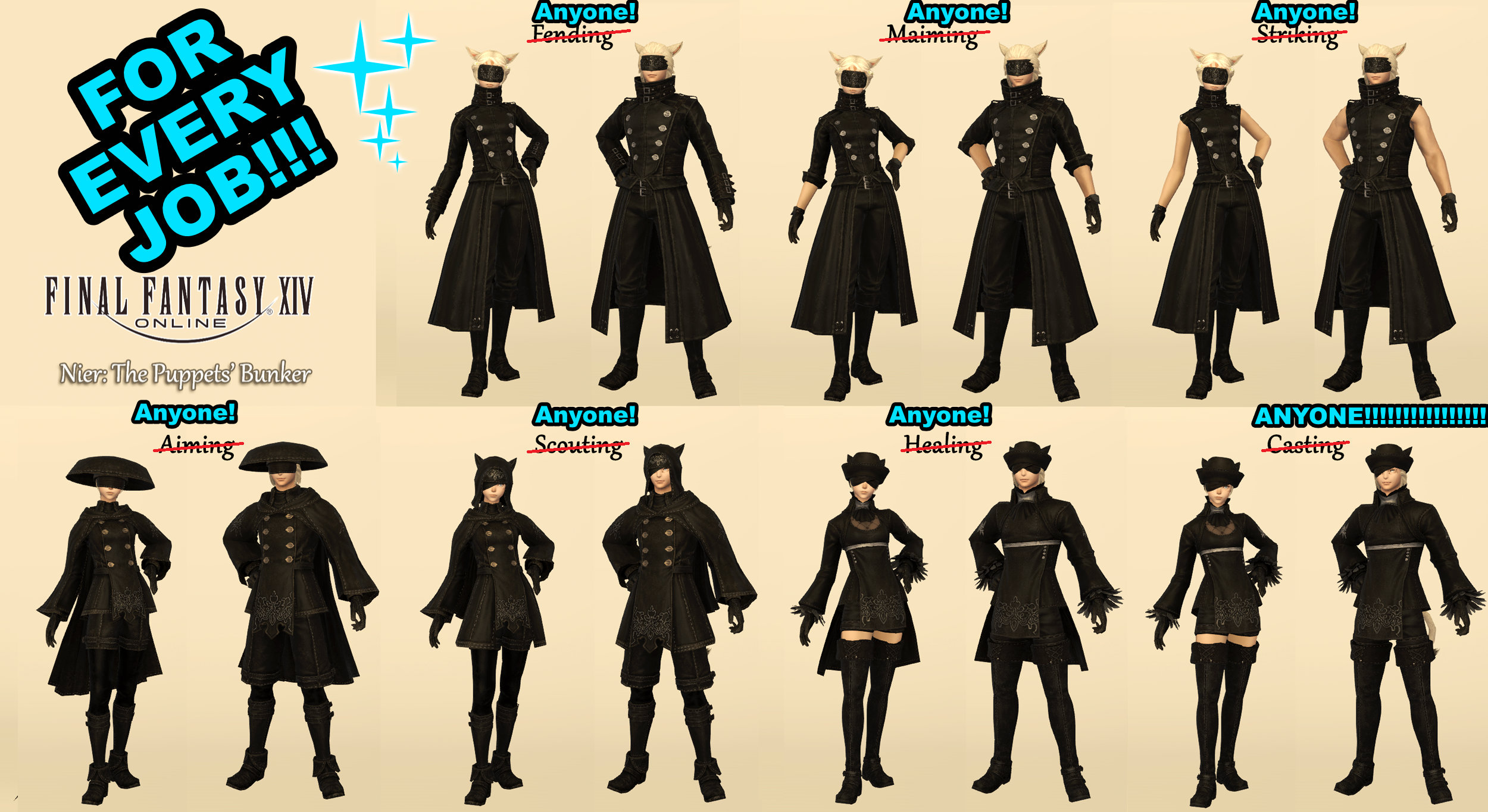 >>724777421The pros outweigh the cons.Yeah, I would have preferred them to restrict the pieces that are very heavily identified with jobs, like AF gear. I don't want to see Pictomancers running around in Dragoon armor.But it'll be liberating to be able to mix and match the sets that had no reason to be locked, like all the Nier raid sets and so on.Still not enough to make me resub.