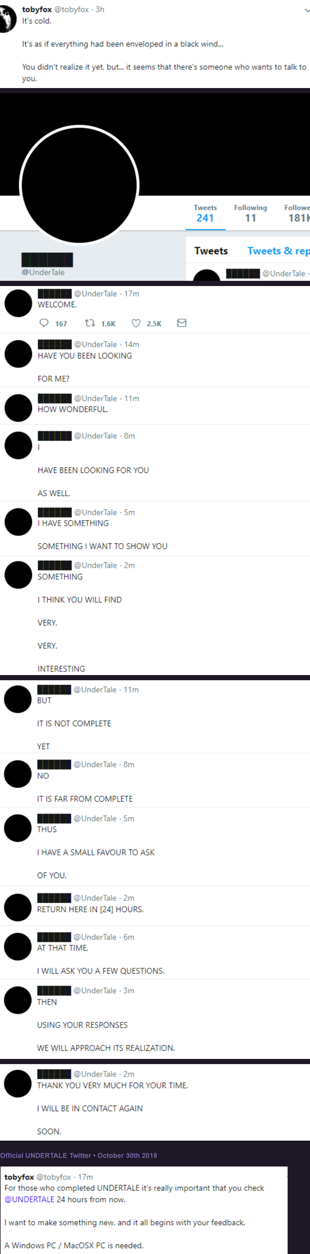 >>724763474People were calling Gaster before we even knew what Deltarune was. ______ is the one who gave us Chapter 1, as SURVEY_PROGRAM.exeWithin Chapter 1, the most blatant Gaster-isms are the phone playing the ENTRY NUMBER 17 noise in the Dark World, The Man, and Seam telling us how Jevil spoke to a "strange someone" who told him the world was a game and made things seem "darker, yet darker." And of course, if you try to input the name "GASTER" in the intro sequence (named GONER_MAKER in the code by the way) the game will immediately crash/reset.On the "meta stuff we didn't know about until after the game came out" level, the earliest versions of "deltarune.com" from around 2016 are hidden messages written in Wingdings in black text on a black background, titled "him.png". The first message was THIS NEXT EXPERIMENT SEEMS VERY VERY INTERESTING and the second THREE HEROES APPEARED TO BANISH THE ANGELS HEAVENBy the way, did you know that Toby's holding company for the rights of Undertale and Deltarune is Royal Sciences, LLC?