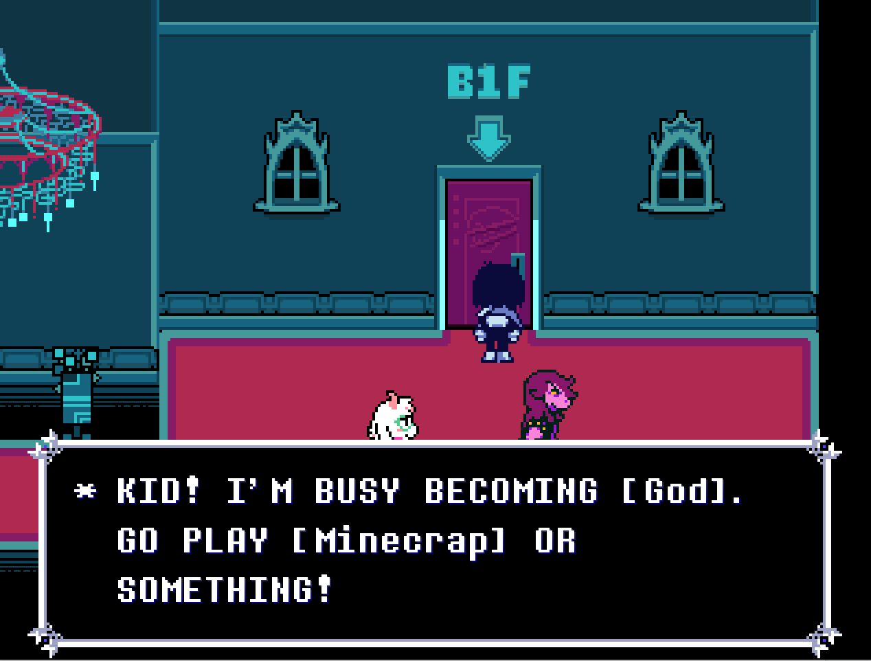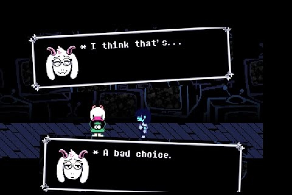 >>724766628I think being stuck on Chapter 2 for four years warped people's perception of how Silly of a game Deltarune was. There are gags in Chapter 4 that are wackier than anything that happens in Chapter 1. That silly little boy Lancer gets scared because we were going to kill his dad and then Susie tries to kill him for betraying us, do we remember that?>>724766812Did you also get mad when you beat Mettaton in Undertale and it didn't have any more skeletons doing fart jokes after that?