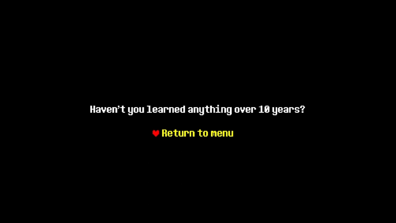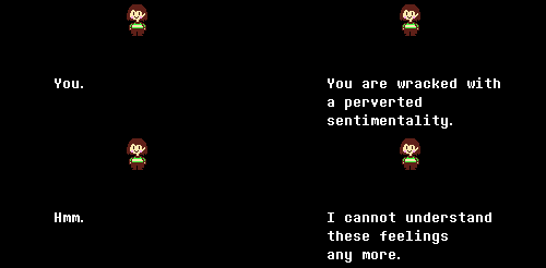 >>724810172if seeing the end just because I can is such a bad thing, that that hack Toby Fox should have given me a genuine character so I could connect to the game's world, instead of not, the way he did.
