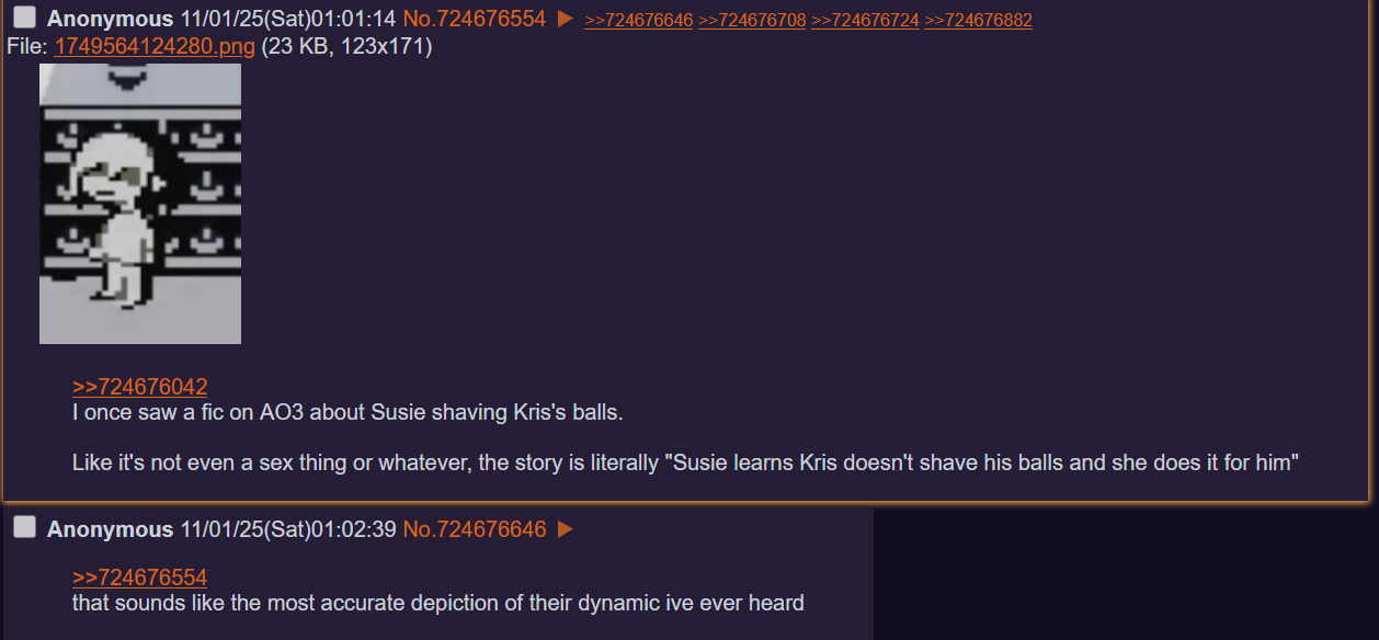 >>724807375Unironically Chara actually does suck you off for doing it but everyone gaslighted themselves on the contrary just because of soulless pacifist.