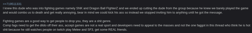 This has been one of the most absurd threads I have seen in a while.Someone actually plays vidya and likes it, to the point he doesn't even mind losing to a pro or being a mu practice for said pro. In fact he's happy to been able to play against him(and even got a game from pro which is kinda cool)And /v/ fucking loses it.Starts calling it embarrassing.Says it's humiliation/cuckoldry fetish.Some insists it's abuse, and that all competitive gaming is toxic.Some say it is loser behavior to be in any comp gaming community.Most people don't know anything about comp gaming but starts talking like they know anything and how one should feel about playing comp and that pros shouldn't play against willing newbies/mid-level players etc.Yeah, tourneyfags have always been tourneyfags but Jesus Christ. This is one of the best examples what is wrong with /v/. You simply can't even be happy for someone's non-mainstream hobby/experience. "You should be playing real sports". /v/ is basically blue /b/ but this is new level of normalfaggotry.Imagine.If you are good at vidya or want to be good at vidya and be in community where people like vidya, you are considered a loser in /v/.