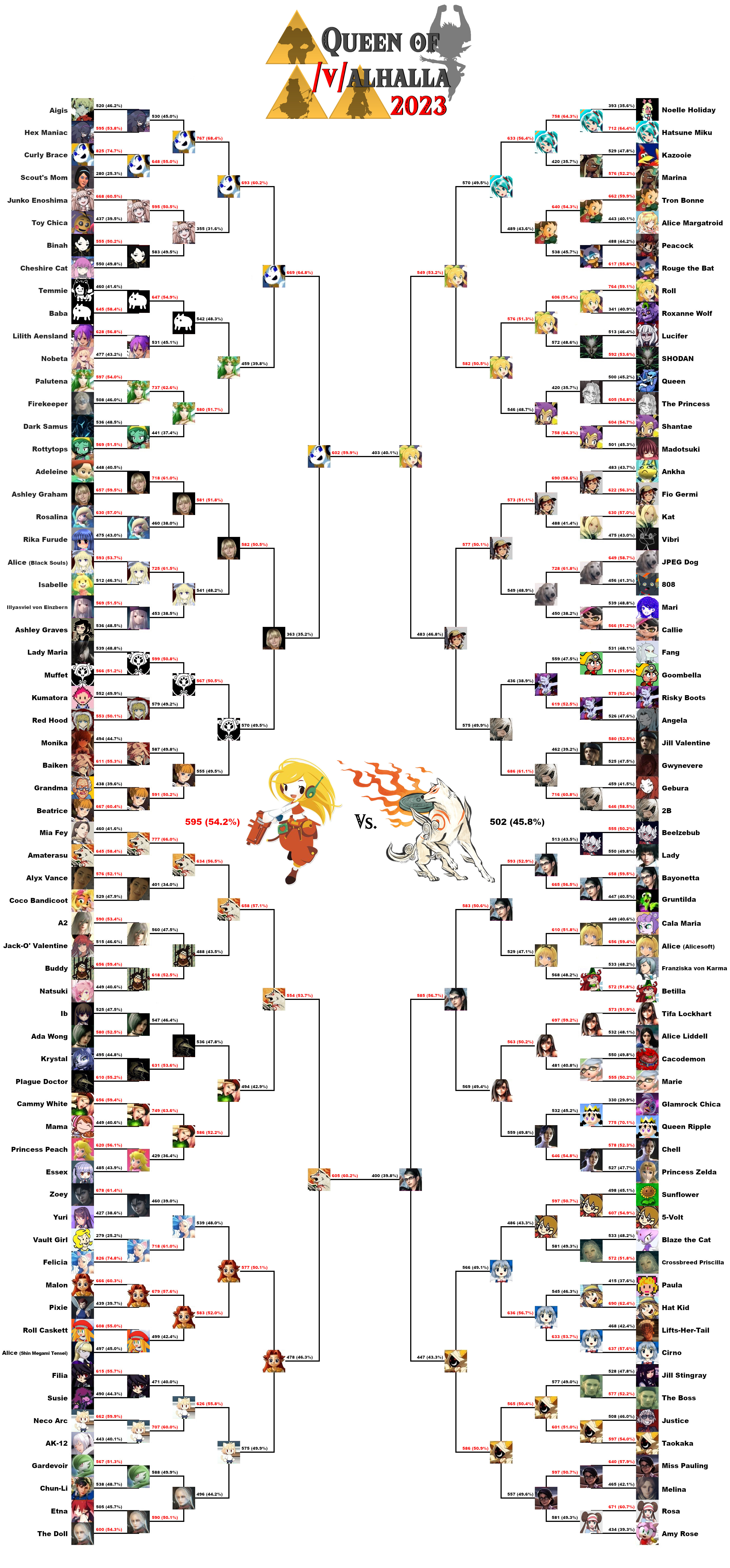 >>724835821>>724836067>>724836285>>724836363>implying anything vaguely furry/scalie is going to get farCharacters like Krystal and Fang were spite voted out of the first round despite being bracketed against complete nobodies because of weebs and the even the tournament organizers themselves (like the one retard who tried to disqualify Fang because her popularity came from a "fan game" but then tried to allow an actual troon character).You'd have to do some MASSIVE botting to see any of these characters get far.
