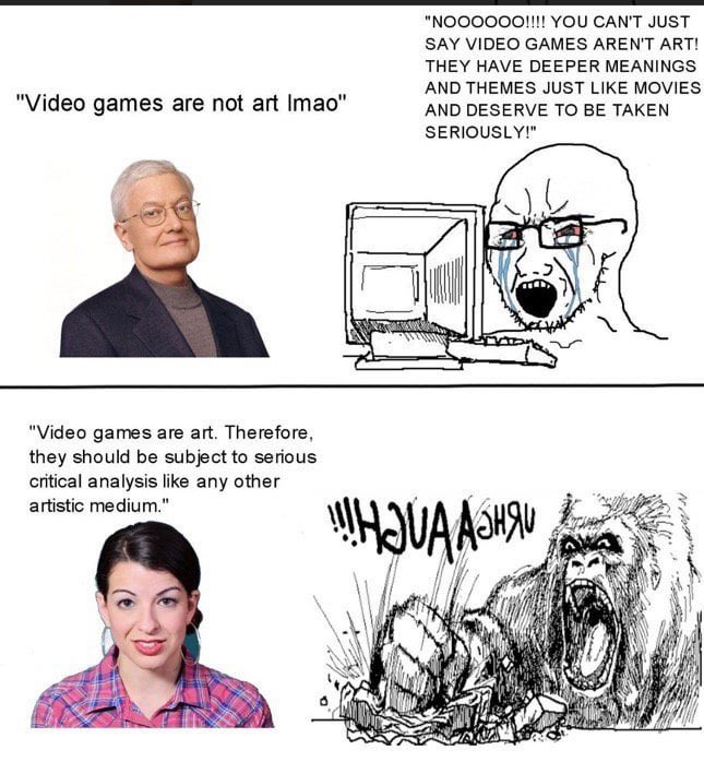 >>724871615Both of them are wrong, video games contain art but they are different from being just art when interacted with. Name one other art that permits interactivity.