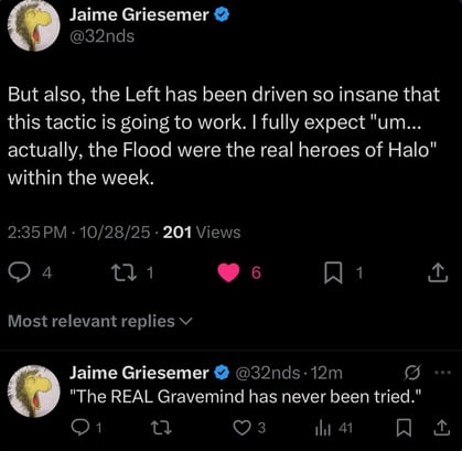 >>724869714He thinks that a twitter account posting halo memes is the same as using video games to push the creator's politics.