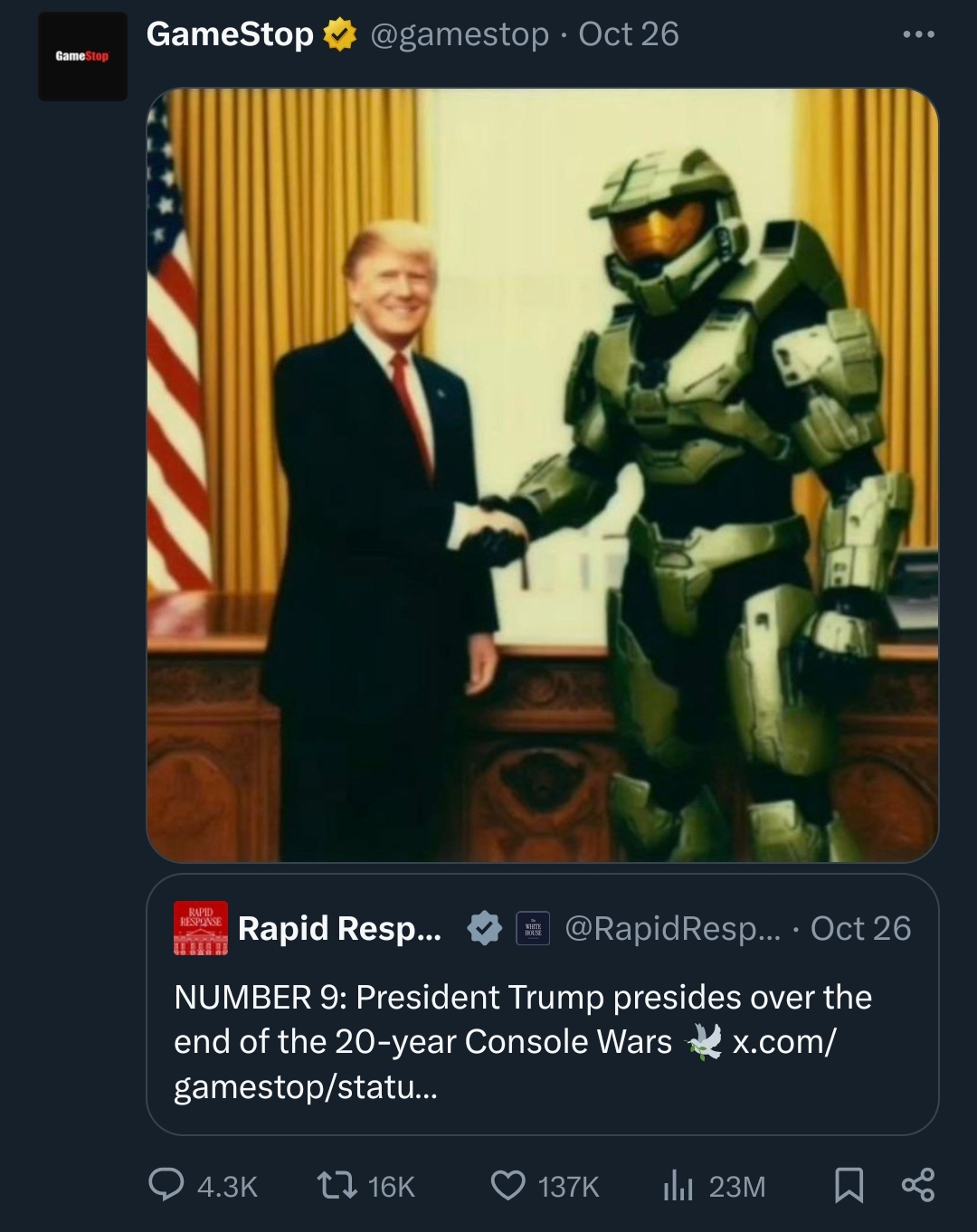 >video games are completely subverted to become trojan horses for progressive cultural propaganda Umm you're just imagining things incel! >White house appeals to the manosphere by posting an AI sloppa of master chief WOW I GUESS RIGHTIES ARE OK WITH POLITICS IN THEIR VIDEO GAMES AFTER ALL???