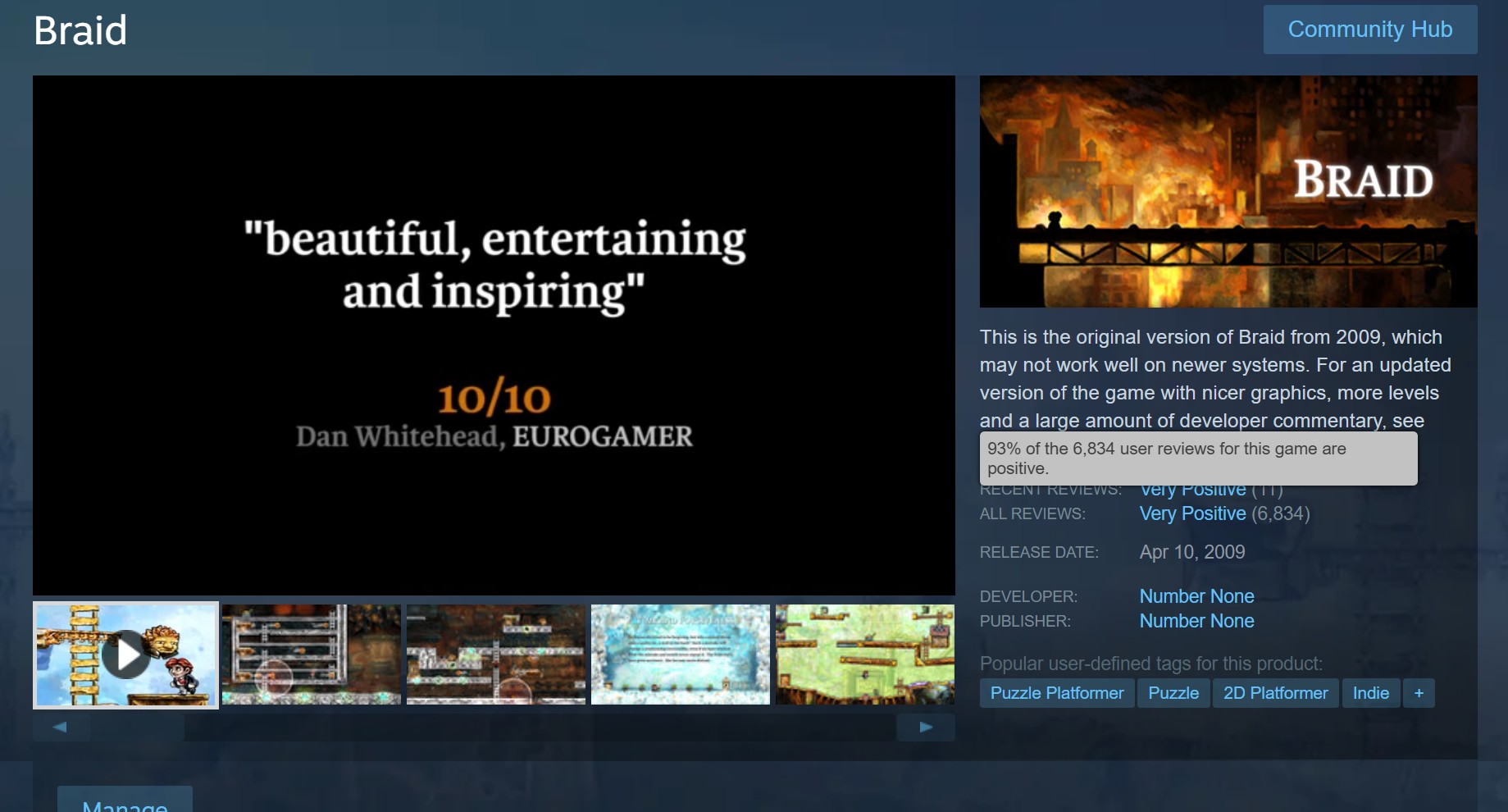 >>724968813i'm an old fart that only heard about braid when it's remaster failed so fucking miserablynothing about the game looks interesting, so i've never paid it any mind other than to laugh at what a failure it was