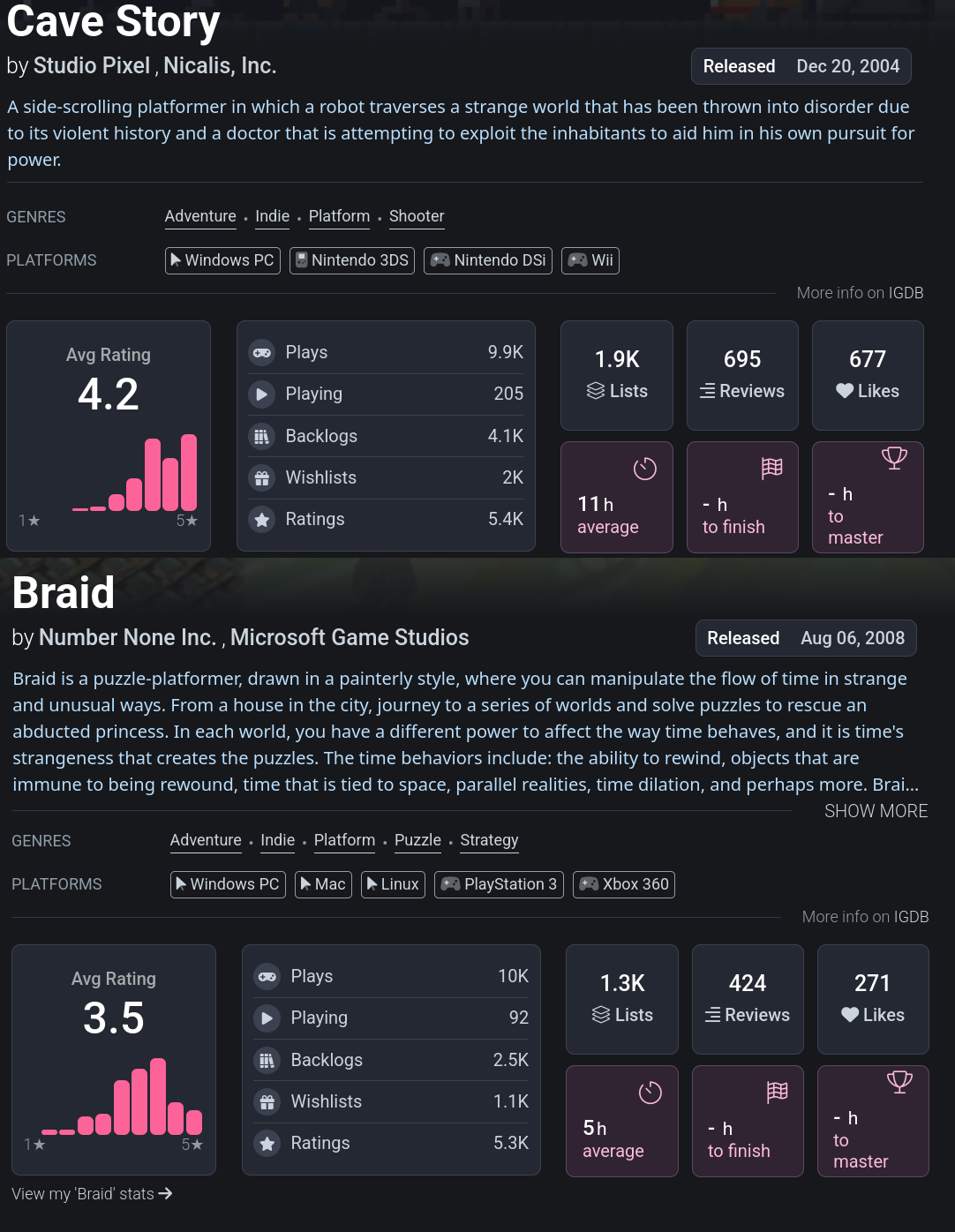 >>724921558I can find a thousand articles praising Braid, all Cave Story has is a wikipedia page and an audience of five, maybe six.