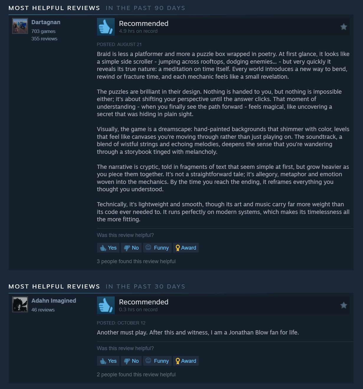 >>724910598>>724920807nigga said braid was the best platformer when that shit is barely even a platformer in any real sense kekhe's made 2 puzzle games and is making a 3rd puzzle game to showcase his programming languagethe witness sucks shit toodude is super bright no doubt but his games are not particularly great