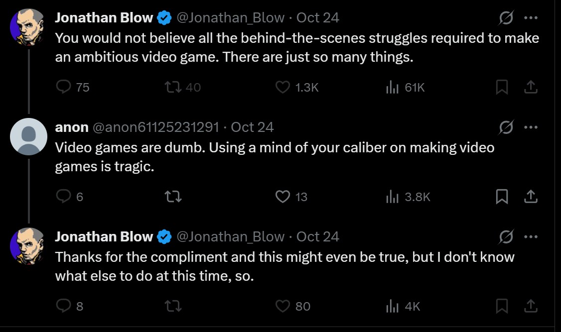 The problem with Jonathan Blow is that he has been told since ever that he's the smartest guy in the room. Ill give him credit for that, because he's most likely the smartest guy in the room. But that has made him a fucking aching idiot that spews nothing but retarded take after retarded take with the same confidence as "the smartest guy in the room". His ego is his biggest issue. He really believes everything he says is the pinnacle of human brain power and not being humble is gonna give him a wake up call soon enough. Every artist should be humble. Only then can they produce good art.
