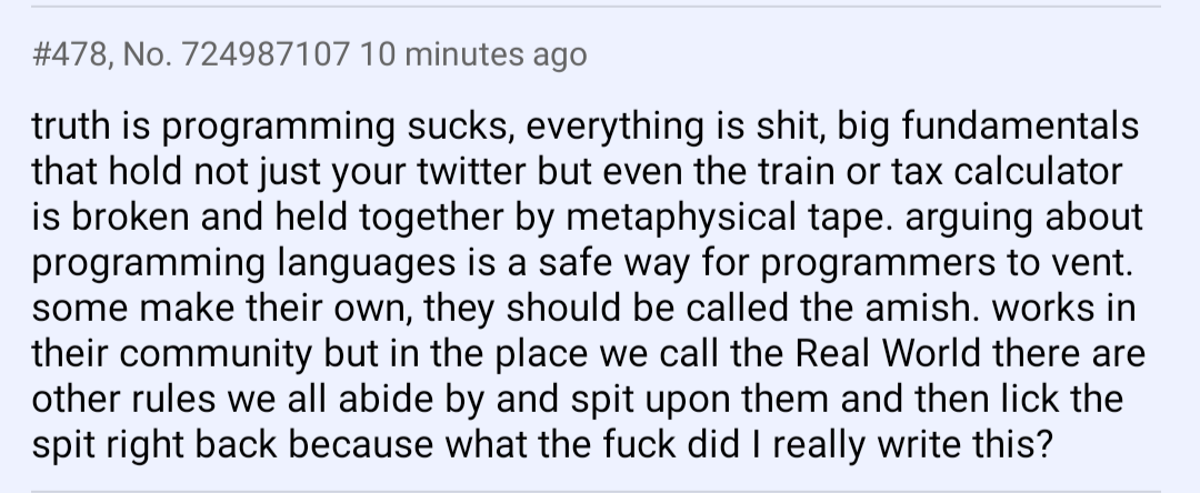 truth is programming sucks, everything is shit, big fundamentals that hold not just your twitter but even the train or tax calculator is broken and held together by metaphysical tape. arguing about programming languages is a safe way for programmers to vent. some make their own, they should be called the amish. works in their community but in the place we call the Real World there are other rules we all abide by and spit upon them and then lick the spit right back because what the fuck did I really write this?
